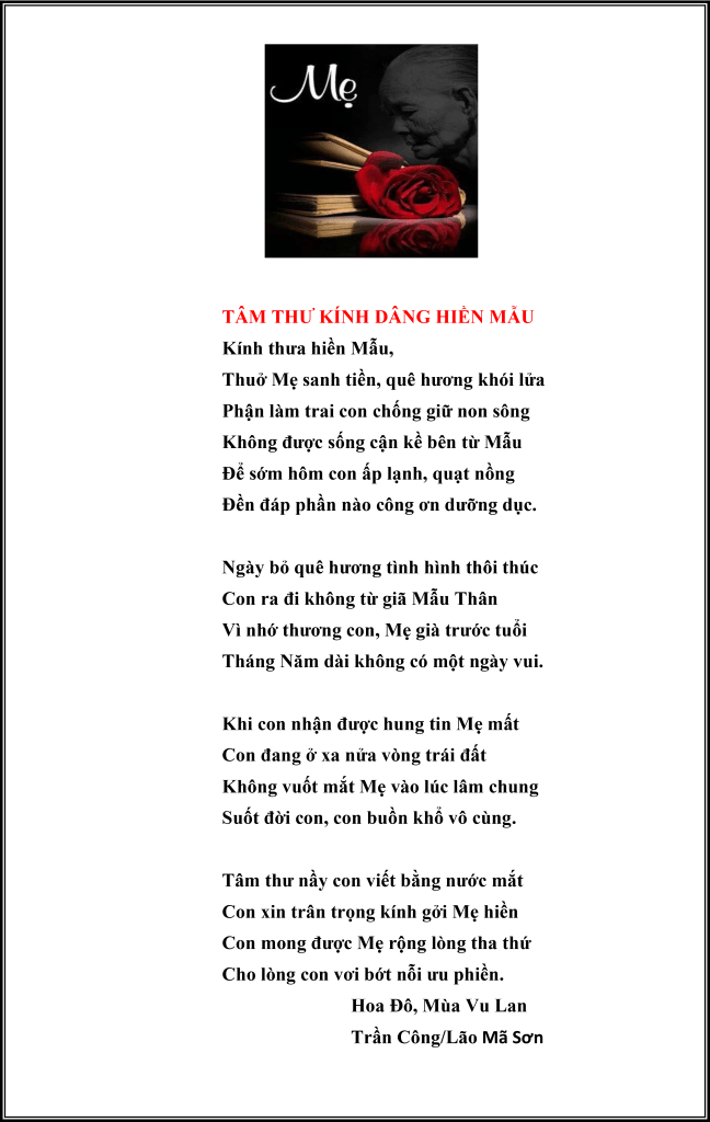 | NHỚ MẸ HIỀN. Nhớ thương Mẹ lắm, Mẹ hiền ơi! Mẹ đã xa con mãi mãi rồi Đã mấy mươi năm con mất Mẹ Mà lòng thương nhớ vẫn không nguôi. Mẹ đã đưa con đến với đời Khổ công dưỡng dục con nên người Đến ngày ly loạn con xa Mẹ Không gặp mẫu thân thưa mấy lời. Ngày Mẹ bước lên tàu thiên cổ Con đang lưu lạc ở quê người Không về gặp Mẹ giờ phút cuối Đau lòng con lắm, Mẹ hiền ơi! Nuôi con nhờ lúc tuổi về già Đến lúc Mẹ già, con bỏ đi Tích cốc phòng cơ, cơ bất cốc Dưỡng nhi đãi lão, lão vô nhi. Hương lòng bốc khói tận trời xanh Tưỡng nhớ công ơn đấng sanh thành Đã lở kiếp nầy con bất hiếu Xin nguyền đáp nghĩa kiếp lai sanh. Hoa Đô(Lockwood House) Trần Công/Tiền Giang Tử. TÂM THƯ KÍNH DÂNG HIỀN MẪU Kính thưa hiền mẫu, Thuở Mẹ sanh tiền,quê hương khói lửa Phận làm trai,con chống giữ non sông Không được sống cận kề bên hiền mẩu Để sớm hôm con ấp lạnh, quạt nồng Đền đáp phần nào công ơn dưỡng dục. Ngày rời quê hương tình hình thôi thúc Khi ra đi con không từ giã mẫu thân Vì nhớ thương con,Mẹ gìa trước tuổi Tháng, Năm dài không có một ngày vui. Khi con nhận được hung tin Mẹ mất Con đang ở xa nửa vòng trái đất Không vuốt mắt Mẹ vào lúc lâm chung Suốt đời con, con buồn khổ vô cùng. Tâm thư nầy con viết bằng nước mắt Con xin kính cẫn gởi đến Mẹ hiền Con mong được Mẹ rộng lòng tha thứ Cho lòng con vơi bớt nỗi ưu tư. Hoa Đô(Lockwood House) Trần Công/Tiền Giang Tử |