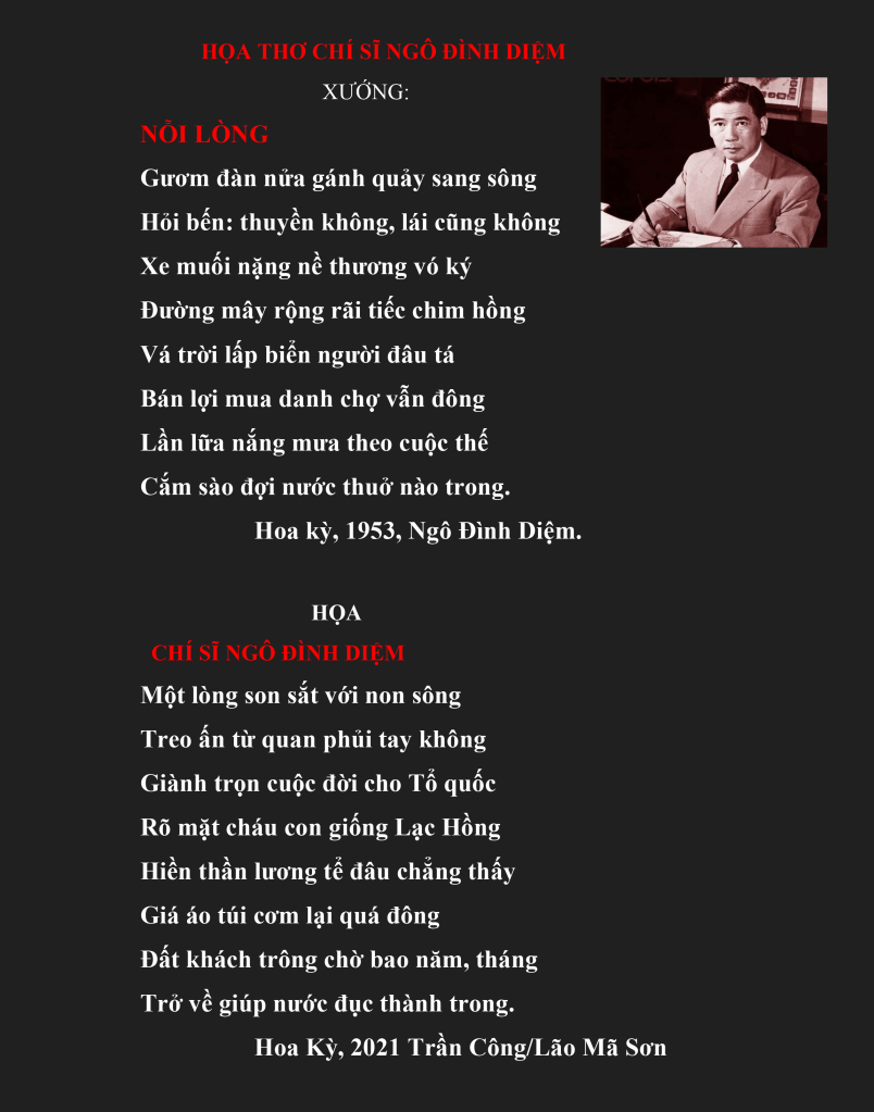 | ĐÊM KHÓ NGỦ NHỚ VỀ QUÁ KHỨ Đêm khó ngủ trăn trở nhìn bóng tối Quá khứ trở về trí nhớ của tôi: Thời tuổi mươi dưới thời Pháp thuộc Nếu tôi an phận với nghề công chức Sẽ sống ấm no suốt cả cuộc đời. Vì yêu nước, tôi bỏ sở dấn thân Tham gia phong trào chống Pháp thực dân. Cùng nhóm bạn tìm đường vào Đồng Tháp Đến Mỹ Tho bị Công an bắt bỏ tù. Sau khi về, vào đảng Tân Dân Chủ Đảng Quốc gia yêu nước của Sinh viên Hợp với Cộng Sản, Cao Đài, Hòa Hảo Tổ chức thành một mặt trận “Việt Minh” Tiếp tục đánh Tây giành lại núi sông. Cuộc chiến gay go sắp sửa thành công Cộng sản Đệ tam độc tài trở mặt Diệc Cao Đài, Hòa Hảo, đảng Quốc gia Trong số đó có đảng Tân Dân Chủ. Tôi thoát được, lên Sài Gòn lánh nạn Sống tạm đến đầu thập niên Năm chục Miền Nam được hoàn toàn độc lập (1) Từ Năm đó tôi bắt đầu gia nhập Vào Quân đội, sang Cảnh Sát Quốc Gia Tiếp tục chống cộng đến ngày mất nước Lưu vong xứ người, sống kiếp tha hương. Hoa Đô, 06-11-2021 Trần Công/Lão Mã Sơn. |