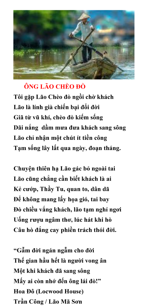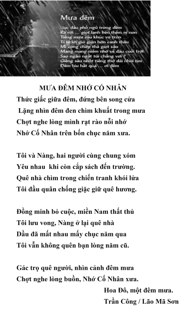 | BÀI CA VỌNG CỔ Mấy mươi năm xa cách quê hương Bài ca Vọng cổ là nỗi nhớ Hai người Á Châu sống tha phương Khi nghe một người ca Vọng cổ Mừng, gặp được người Việt đồng hương. Tôi rất thích nghe ca Vọng cổ Đêm từng đêm trước khi lên giường Tôi mở máy, nghe hai nghệ sĩ Bùi Trung Đẳng và Hồ Minh Đương Đồng trình diễn bài “Đêm Tạ Từ” Hai giọng ca ai oán thê lương. Đất khách giữa khuya nghe Vọng cổ Tôi tưởng mình ở giữa quê hương. Hoa Đô, 2022 Trần Công/Lão Mã Sơn PS-Xin mời quý vị Truy cập Google “Đêm Tạ Từ Hồ Minh Đương”, để thưởng thức. |