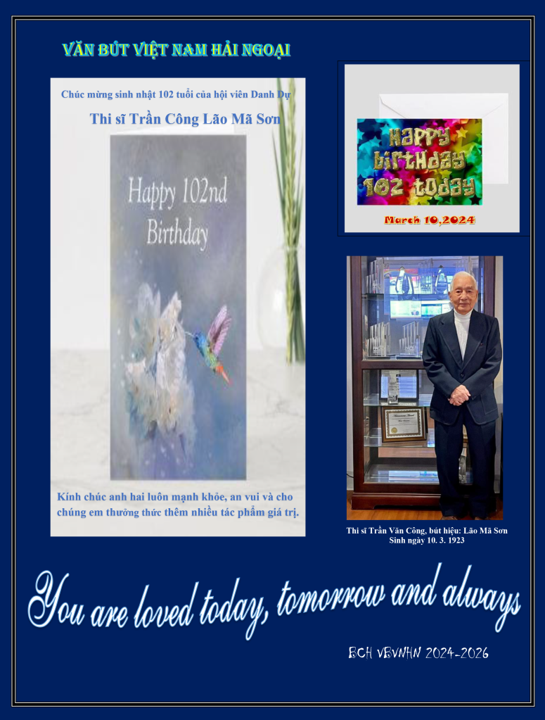| KÍNH CHÚC THỌ ANH HAI TRẦN CÔNG/LÃO MÃ SƠN Đôi dòng mộc mạc tặng anh Hai Bách Tuế cộng ba, tiếp cộng… hoài LÃO MÃ SƠN – thơ chồng biển lớn TRẦN VĂN CÔNG – chữ chất rừng dài Thương dân thuở ấy từng phò trợ Giúp nước ngày xưa đã miệt mài Guinness có khi giành kỷ lục VIỆT NAM VĂN BÚT tiệc trong ngoài… Phương Hoa – July 23, 2025 |