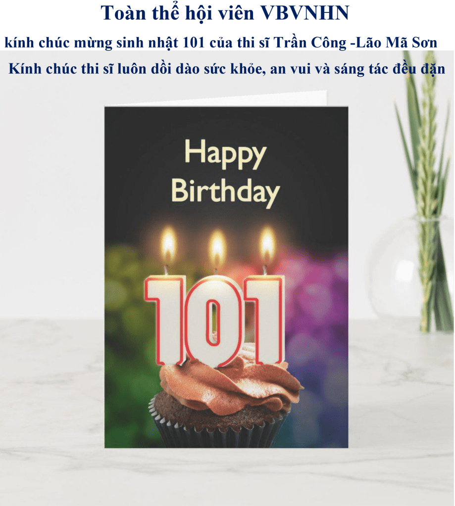 | Chúc Mừng Đại Lão TRẦN CÔNG Chúc mừng đại lão TRẦN CÔNG, Hơn trăm tuổi lẽ, nụ cười vẫn tươi! Thơ văn thi phú viết đều, Tôn vinh “Ông Lão TUYỆT VỜI” lắm thay! Tuổi cao mà trí trẻ măng! Vẫn cười vẫn nói nhã thơ liên hồi! 7/23/2025 LÊ MỘNG HOÀNG và đàn em VBVNHNVDBHK |
