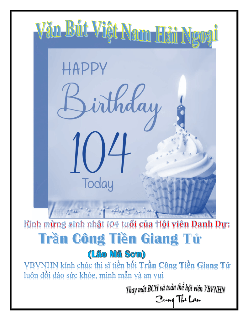 | Chúc Mừng Đại Lão TRẦN CÔNG Chúc mừng đại lão TRẦN CÔNG, Hơn trăm tuổi lẽ, nụ cười vẫn tươi! Thơ văn thi phú viết đều, Tôn vinh “Ông Lão TUYỆT VỜI” lắm thay! Tuổi cao mà trí trẻ măng! Vẫn cười vẫn nói nhã thơ liên hồi! 7/23/2025 LÊ MỘNG HOÀNG và đàn em VBVNHNVDBHK |
