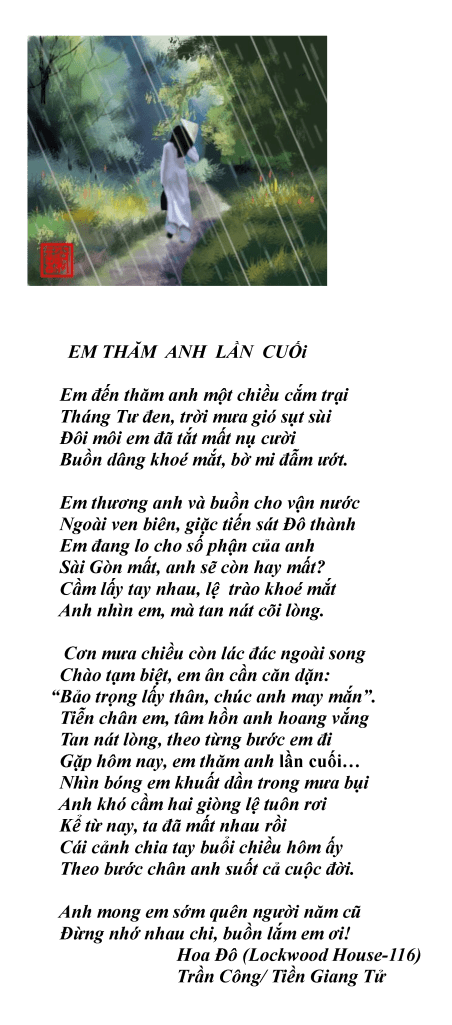 | THÁNG TƯ ĐEN Mỗi độ tháng Tư về trên đất khách Tôi nhớ về thời quá khứ đã qua Ba mươi tháng Tư, mất nước tan nhà Đất khách, tôi ôm mối hờn vong quốc Cuộc đổi đời, tôi xang bang xất bất Đàng thê nhi nặng gánh toát mồ hôi Vài chục năm sau hiền phụ qua đời Gác trọ Nhà Già, mình tôi chiếc bóng Trên bốn mươi năm mất nước tan nhà Nhìn lại mái đầu, tóc trắng như hoa Mỗi tháng Tư sang, tâm tư thổn thức Buồn phận mình, người thất quốc ly gia. Hoa Đô(Lockwood House) Trần Công/Lão Mã Sơn. |