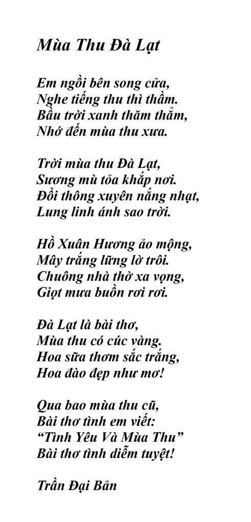 | ĐÀ LẠT NIỀM THƯƠNG VÀ NỖI NHỚ Đà Lạt bây giờ xa quá xa, Tiếc nhớ, ai không khỏi ngậm ngùi. Văn Học, Thăng Long, trường xưa cũ, Đức Trọng,Văn Khoa, nhớ một trời. Từ chốn lao tù tôi trở lại, Thành phố u hoài vắng tiếng ca. Những người bạn cũ nay đâu cả? Học trò tản mạn bốn phương xa! Tôi đi trong nỗi niềm cô quạnh, Người thấy tôi chào- mắt ngó lơ. Có lẽ người ta vì quá sợ, Sợ vì liên hệ, phải làm ngơ? Một hôm trên bến xe đò xuống, Người lính năm xưa ngó sững sờ. Chạy đến ôm tôi, buồn nức nở : “Đại uý trông gầy, quá khác xưa! Đại uý làm gì nên tội nhỉ? Mà sao tù tội đến bây giờ?” ……………………………………………. Ba, bốn công an nhìn soi mói, Vội vàng tôi nói lãng, chặn lời: “Hôm nào rảnh rỗi anh thăm viếng, Sẽ cùng tâm sự nỗi niềm riêng.” Vật đổi, sao dời nay mới thấy, Giáo sư môn toán dạy cùng trường. Tôi muốn hỏi thăm, thầy ái ngại, Áo bằng bao cát đã sờn vai! Xe đẩy, thân, yên đầy bao bị, Ve chai kiếm sống, kiếp lưu đày! Buồn gởi vần thơ lên trang giấy, Nhớ về dĩ vãng, tháng năm trôi. Nay ta yên sống phương trời mới, Đà Lạt, dành riêng một góc trời. Trần Đại Bản (2013) |