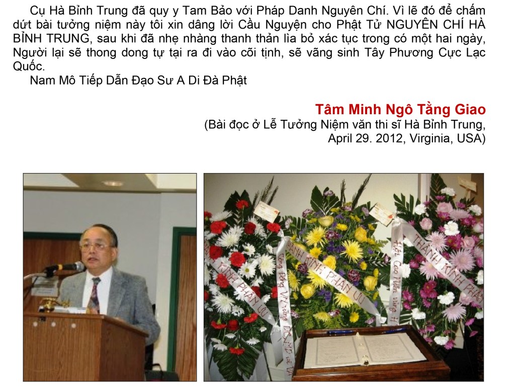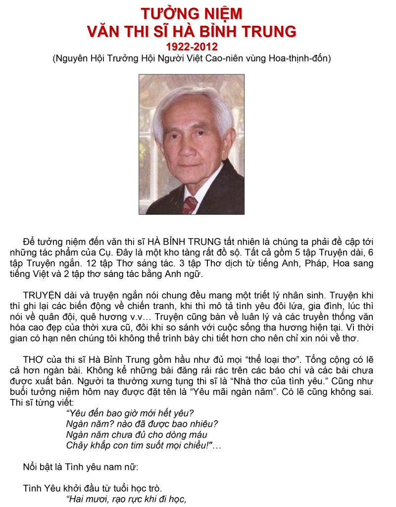 | Vĩnh biệt thi sĩ Hà Bỉnh Trung ngày 29 tháng 4 năm 2012 Văn thi sĩ Hà Bỉnh Trung có các bút hiệu Hà Bỉnh Trung, Hoa Nguyên, Hồng Bảo Trước năm 1975 dạy ngoại ngữ Anh Pháp, viết văn làm thơ và là hội viên Văn Bút Việt Nam từ năm 1964 Sau năm 1975: Cư ngụ tại Hoa Kỳ. Chủ Tịch Trung Tâm Văn Bút Miền Đông Hoa Kỳ (2 nhiệm kỳ 1997-99 và 2001-2003 ) Có nhiều tác phẩm văn thơ đặc biệt nhiều thi phẩm chuyển ngữ sang Anh văn và Pháp văn. Đặc biệt các tác Phẩm Anh Hoa (Thơ dịch Anh Việt đối chiếu) đoạt Giải Thưởng Văn Học, Bộ Môn Dịch Thuật, năm 1965 của Phủ Quốc Vụ Khanh Văn Hóa tại Saigon. (Tóm lược theo nhà biên soạn Phạm Văn Tuấn) |