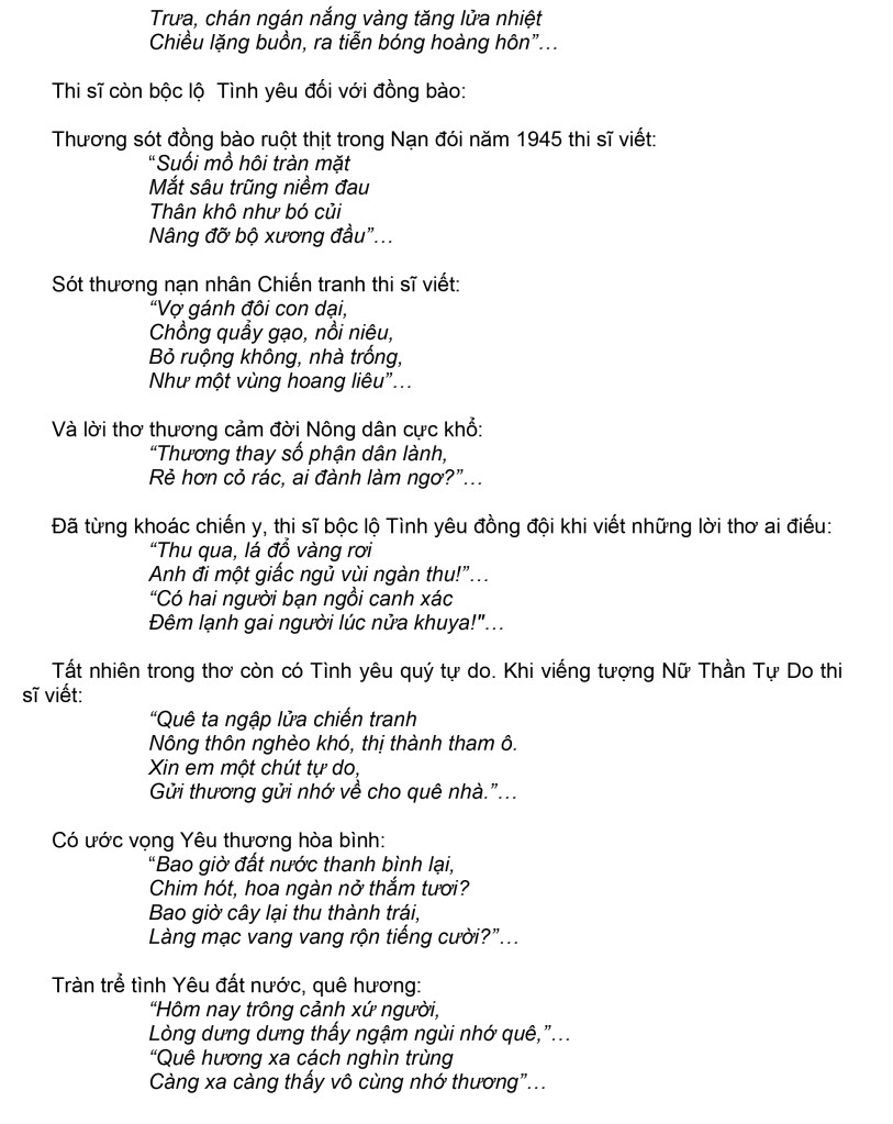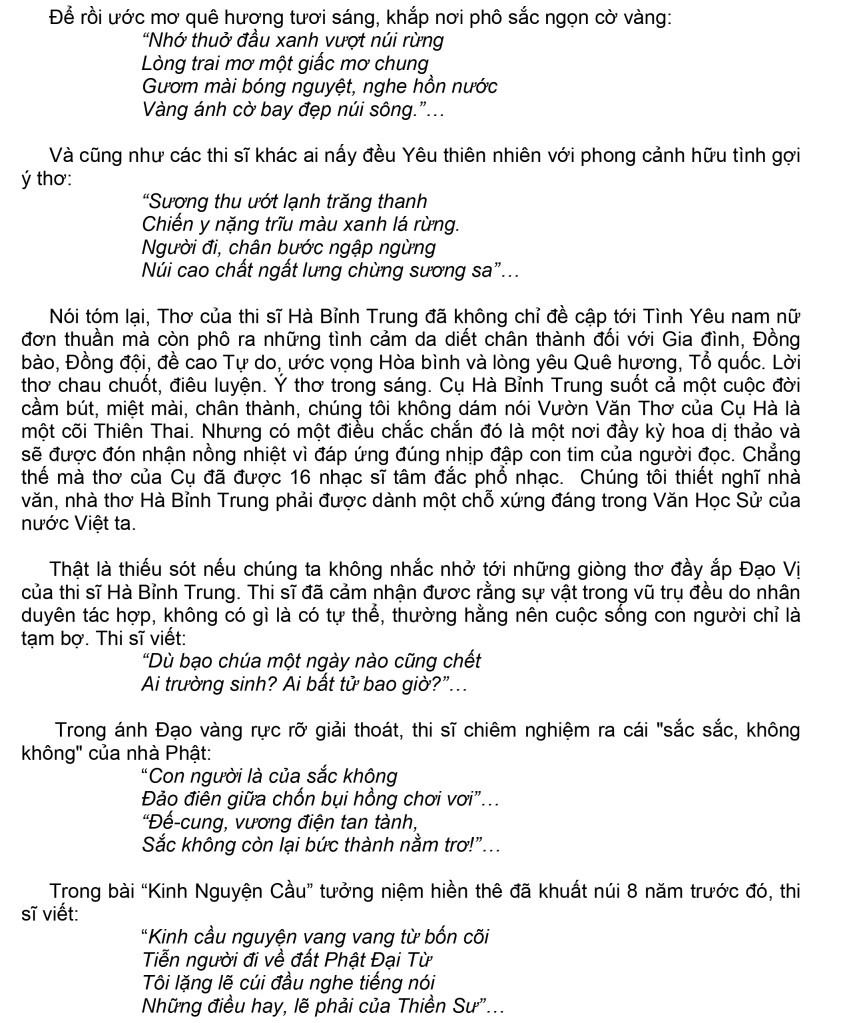 | TƯỞNG NIỆM VĂN THI SĨ HÀ BỈNH TRUNG Kính thưa toàn thể quý vị, Để tưởng niệm đến văn thi sĩ HÀ BỈNH TRUNG tất nhiên là chúng ta phải đề cập tới những tác phẩm của Cụ. Đây là một kho tàng rất đồ sộ. Tất cả gồm 5 tập Truyện dài, 6 tập Truyện ngắn. 12 tập Thơ sáng tác. 3 tập Thơ dịch từ tiếng Anh, Pháp, Hoa sang tiếng Việt và 2 tập thơ sáng tác bằng Anh ngữ. Truyện dài và truyện ngắn nói chung đều mang một triết lý nhân sinh. Truyện khi thì ghi lại các biến động về chiến tranh, khi thì mô tả tình yêu đôi lứa, gia đình, lúc thì nói về quân đội, quê hương v.v… Truyện cũng bàn về luân lý và các truyền thống văn hóa cao đẹp của thời xưa cũ, đôi khi so sánh với cuộc sống tha hương hiện tại. Vì thời gian có hạn nên chúng tôi không thể trình bày chi tiết hơn cho nên chỉ xin nói về thơ. Thơ của thi sĩ Hà Bỉnh Trung gồm hầu như đủ mọi “thể loại thơ”. Tổng cộng có lẽ cả hơn ngàn bài. Không kể những bài đăng rải rác trên các báo chí và các bài chưa được xuất bản. Người ta thường xưng tụng thi sĩ là “Nhà thơ của tình yêu.” Cũng như buổi tưởng niệm hôm nay được đặt tên là “Yêu mãi ngàn năm”. Có lẽ cũng không sai. Thi sĩ từng viết: “Yêu đến bao giờ mới hết yêu? Ngàn năm? nào đã được bao nhiêu? Ngàn năm chưa đủ cho dòng máu Chảy khắp con tim suốt mọi chiều!”… Nổi bật là Tình yêu nam nữ: Tình Yêu khởi đầu từ tuổi học trò. “Hai mươi, rạo rực khi đi học, Thấy áo em bay phía cuối đường, Nán bước chờ em, lòng hớn hở Để cùng trao ánh mắt yêu đương” Với tâm hồn lãng mạn tình yêu kéo dài tới hồi trai trẻ: “Người nằm xa lạ trong mơ Tỏa thơm mùi tóc vàng tơ gối đầu. Môi nào tìm lại môi nhau, Sáng ra tỉnh giấc còn đâu dáng hồng”… Tất nhiên sẽ có men rượu, có khói thuốc, có cả lời ca, tiếng nhạc…: “Em mời ta chén rượu cay Để thương nhớ mãi đêm này gặp nhau. Môi mềm nhắp chén tê đau Mắt đen trĩu nặng ý sầu từ ly.”… Có chia ly nơi bến thuyền, ga vắng, phi trường: “Tàu đi, ga vắng một người, Mây trôi lãng đãng chân trời nhớ nhung”… Có hôn nhân đôi lứa kết thúc cuộc tình đẹp: “Ngày mai, anh đón em, em nhé! Lộng lẫy xe hoa kết pháo hồng”… Tình yêu kéo dài cho đến tuổi già: “Khi yêu, yêu đến bạc đầu, Thời gian không hẹn phai màu tóc xanh”… Thật ra Thơ của thi sĩ Hà Bỉnh Trung không chỉ giới hạn trong vòng lãng mạng nam nữ thường tình mà còn trải rộng ra nhiều lãnh vực cao cả hơn. Chúng ta được đọc những lời thơ nói lên Tình yêu trong gia đình: Thi sĩ từng bày tỏ lòng kính yêu với Song Thân mình: “Thương cha mẹ đã qua đời Lại thương ngàn dặm xa vời nước non”… Lòng yêu thương Con Cháu: “Con mở mắt chào đời. Thương biết mấy! Ngọc lưu ly màu tinh khiết trắng ngần. Trán con sáng như khoảng trời nắng dậy Một màu xanh không gợn chút phù vân”… Lòng thương tưởng người Vợ hiền đã xa lìa cõi tục 8 năm trước đó: “Tôi, một bóng sống cô đơn Sáng, chờ đợi ánh bình minh tha thiết Trưa, chán ngán nắng vàng tăng lửa nhiệt Chiều lặng buồn, ra tiễn bóng hoàng hôn”… Thi sĩ còn bộc lộ Tình yêu đối với đồng bào: Thương sót đồng bào ruột thịt trong Nạn đói năm 1945 thi sĩ viết: “Suối mồ hôi tràn mặt Mắt sâu trũng niềm đau Thân khô như bó củi Nâng đỡ bộ xương đầu”… Sót thương nạn nhân Chiến tranh thi sĩ viết: “Vợ gánh đôi con dại, Chồng quẩy gạo, nồi niêu, Bỏ ruộng không, nhà trống, Như một vùng hoang liêu”… Và lời thơ thương cảm đời Nông dân cực khổ: “Thương thay số phận dân lành, Rẻ hơn cỏ rác, ai đành làm ngơ?”… Đã từng khoác chiến y, thi sĩ bộc lộ Tình yêu đồng đội khi viết những lời thơ ai điếu: “…Thu qua, lá đổ vàng rơi Anh đi một giấc ngủ vùi ngàn thu!”… …Có hai người bạn ngồi canh xác Đêm lạnh gai người lúc nửa khuya!””… Tất nhiên trong thơ còn có Tình yêu quý tự do. Khi viếng tượng Nữ Thần Tự Do thi sĩ viết: “Quê ta ngập lửa chiến tranh Nông thôn nghèo khó, thị thành tham ô. Xin em một chút tự do, Gửi thương gửi nhớ về cho quê nhà.”… Có ước vọng Yêu thương hòa bình: “Bao giờ đất nước thanh bình lại, Chim hót, hoa ngàn nở thắm tươi? Bao giờ cây lại thu thành trái, Làng mạc vang vang rộn tiếng cười?”… Tràn trể tình Yêu đất nước, quê hương: “…Hôm nay trông cảnh xứ người, Lòng dưng dưng thấy ngậm ngùi nhớ quê,”… “…Quê hương xa cách nghìn trùng Càng xa càng thấy vô cùng nhớ thương”… Để rồi ước mơ quê hương tươi sáng, khắp nơi phô sắc ngọn cờ vàng: “Nhớ thuở đầu xanh vượt núi rừng Lòng trai mơ một giấc mơ chung Gươm mài bóng nguyệt, nghe hồn nước Vàng ánh cờ bay đẹp núi sông.”… Và cũng như các thi sĩ khác ai nấy đều Yêu thiên nhiên với phong cảnh hữu tình gợi ý thơ: “Sương thu ướt lạnh trăng thanh Chiến y nặng trĩu màu xanh lá rừng. Người đi, chân bước ngập ngừng Núi cao chất ngất 