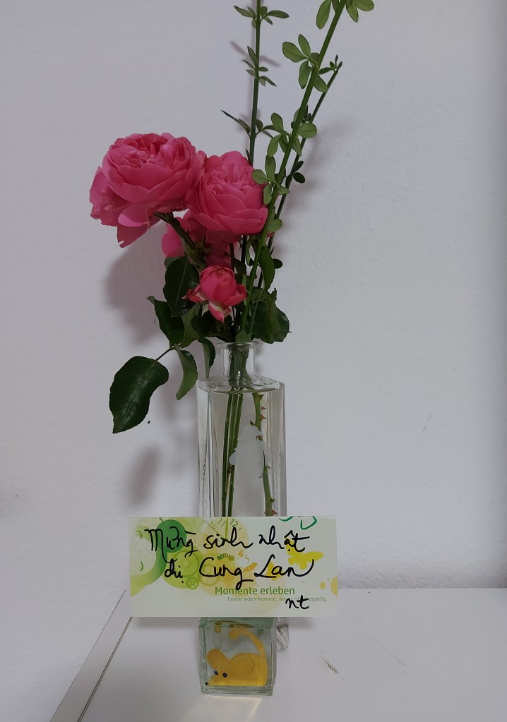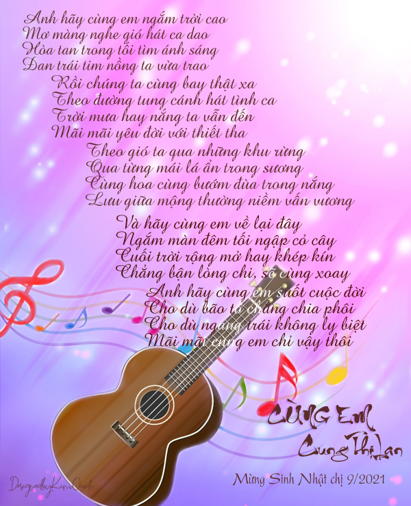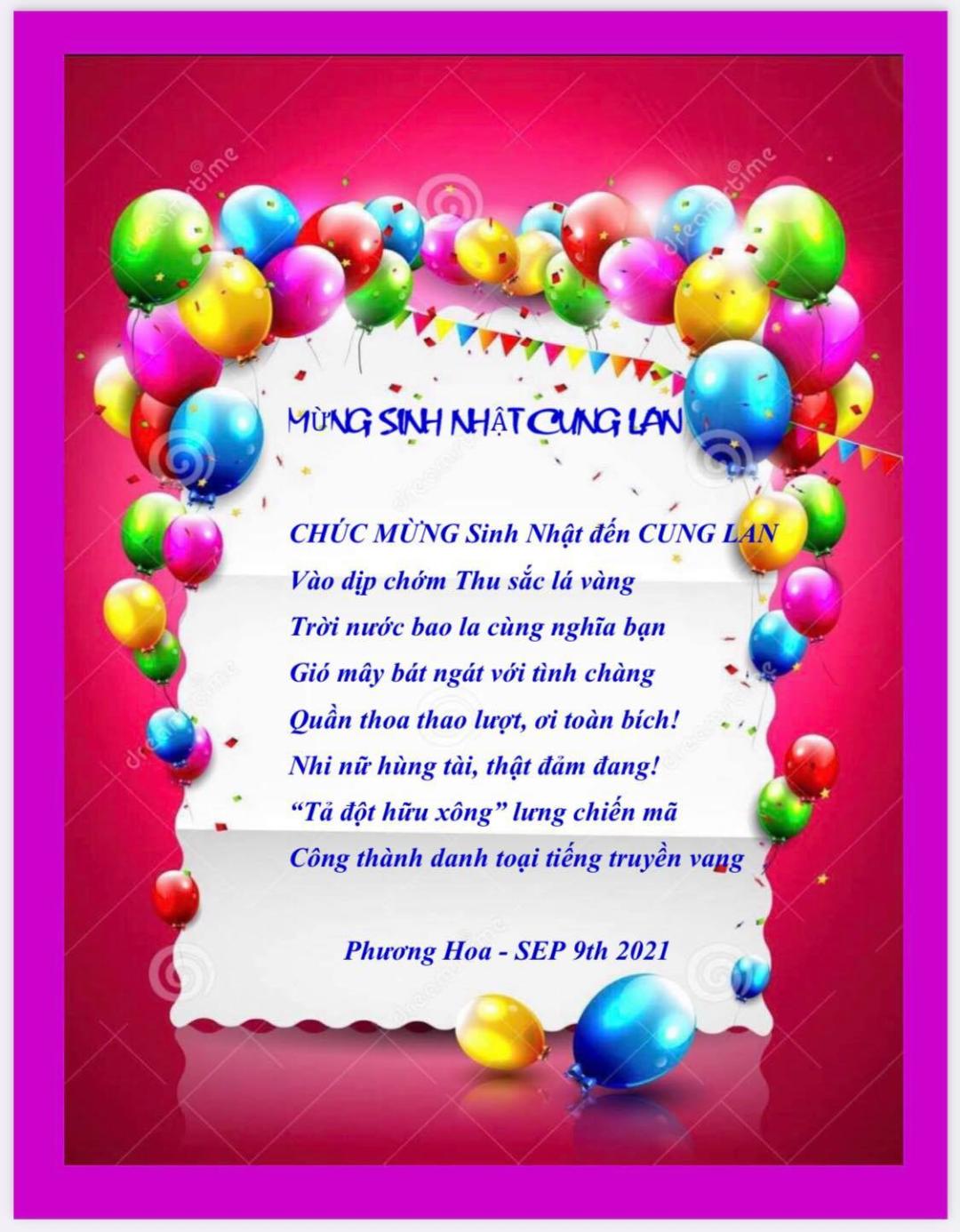 | Chị Cung Lan thương mến,Cho em gởi lời chúc sinh nhật muộn đến chị. Thương chúc chị Cung Lan luôn an lành vui khỏe. Trái tim tràn đầy nhiệt huyết, yêu thương của chị làm đẹp nhân gian, làm ai cũng yêu đời, yêu người theo chị đó. Em gởi tặng chị vài hoa lá trong vườn nhà, những “tác phẩm” của em gái vườn quê Ngọc Thúy đó chị. Thời gian qua em bận nhiều việc, cho nên chậm trễ mọi chuyện. Em thấy chị giỏi quá chừng. Chị lo toan bao nhiêu việc, toàn và chuyện lớn, mà chuyện nào cũng chu toàn. Hoàng Quân-Ngọc Thúy |