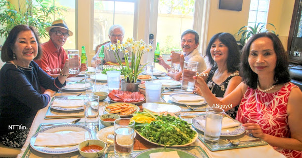 Văn Bút & Minh Châu Trời Đông Mừng Sinh Nhật Cung Thị Lan![]() Anh Thuần và BBT thân mến, Hôm qua là Sinh Nhật của Cung Lan. Hiệp và CL đã làm một chuyến viễn du từ DC về Nam Cali để họp mặt BBT, gặp bạn bè cùng lớp thời trung học và “nhân tiện” celebrate BD thứ… Buổi họp mặt BBT Nam Cali tại nhà Phan Lang bắt đầu lúc 4 giờ chiều với màn chụp hình “nữ sinh áo trắng” do bốn “lão nữ sinh” Cung Lan, Ánh Nguyệt, chị Tấm và PLang điệu đà trong các tà aó dài tha thướt. Sau đó anh nam sinh NCThuần với quần xanh áo sơ mi trắng nhập bọn. Các nàng thi nhau tạo dáng, làm điệu đủ kiểu, tay ôm tập ĐS e ấp bước tới bước lui, nghiêng bên này ngó bên kia làm chàng NAG Hiệp của CL một mình với hai máy ảnh bự tổ chảng (một của Hiệp, một của PL) và cái cell phone của CL chụp lia lịa không kịp thở nhưng nụ cười vui vẻ, hiền hậu lúc nào cũng nở trên môi. Thật phục quá sức tài chụp hình và sự kiên nhẫn rất quý của người đồng môn VT (11/75) dễ thương này. ![]() Buổi cơm chiều bắt đầu bằng món Nem Nướng do Ánh Nguyệt làm. Ôi chao AN làm món này ngon quá là ngon, nem nướng đã ngon, nhưng ngon nhất là món chả ram dòn rụm và nước chấm tuyệt vời, với PL còn ngon hơn cả nem nướng và nước chấm ở Brodard! Ngoài ra, AN còn mang cả Bắp Thái và Bắp VN luộc với cách luộc bắp độc đáo nên hột bắp thật dẽo mềm, ngon hết xảy. Một số anh chị nói nếu ăn bắp thì sẽ không còn bụng để ăn món Bún Suông Tôm của PL sau đó nên xin ” Bắp to go”. Bắt đền AN vì hai món đầu của em quá ngon nên món Bún Suông Tôm của PL, kỳ công nấu nước dùng đậm đà, quết tôm cho nhuyễn, bắt con suông cho đẹp… hihi… bị “ế” vì mỗi người chỉ ăn được một tô nhỏ. ![]() Đến màn desserts. Trước hết là 5 món tráng miệng của Cung Lan, Bánh Phu Thê, Bánh Dẻo, và một món bánh thật đẹp nữa mà PL xin lỗi quên mất tên do chính tay CL kỳ công làm ở nhà DC và mang tới đây cùng với trái Lê Đại Hàn và Nhãn Lồng. Anh Thuần cũng mang đến một cái Bánh Dẽo to đẹp ngon do chị Kim Oanh làm, tiếc là chị không đến được vì có bạn ở xa về thăm. Phần PL thì có món Almond Delight (“chè” thạch vị hạnh nhân và trái vải). Mọi người ai nấy nhìn nhau cùng lắc đầu vì món nào trông cũng hấp dẫn nhưng bao tử không còn chỗ chứa. ![]() Sau cùng thì Birthday Cake (Rhum cake do PL làm) được mang ra và mọi người hát chúc mừng Sinh Nhật Cung Lan. Lúc cuối thì chỉ có món Chè Thạch với Trái Vải được mọi người chiếu cố vì nó không ngọt lắm và mát cho một buổi chiều hè oi bức. Trong và sau bửa ăn, mọi người nói chuyện cười đùa rôm rả, chuyện BBT ĐS thì ít, mà chuyện đời, chuyện xưa chuyện nay thì nhiều, hihi… ai nấy đều vui vẻ, thân thương trong tình đồng môn hiếm quý. Khoảng gần 10 giờ đêm, mọi người ra về, mỗi người một gói đồ ăn “to go” thật bự, trong sự bịn rịn luyến tiếc và hẹn hò gặp lại Cung Lan & Hiệp, hy vọng trong kỳ ra mắt ĐS trước cuối năm. ![]() À, PL quên kể là mọi người đã rất mong chờ và rồi thất vọng vì Sương Mai & Dũng đã dự định xuôi Nam họp mặt nhưng cuối cùng có chuyện bất ngờ nên không đến được. Tuy không đi được nhưng SM nói sẽ rủ các bạn BBT và các bạn khác Bắc Cali đến thăm Cô Lạc và cũng chụp hình “nữ sinh áo trắng” cùng với hình chụp BBT Nam Cali như là một kỷ niệm cho việc làm ĐS kỷ niệm 60 năm ngày thành lập trường NTH/HT-NT. Xin gửi anh Thuần và quý chị em BBT xem trước hình chụp hôm qua cho vui. Khi có hình chụp Bắc Cali, PL sẽ làm chung một album hình và gửi lên DĐ hai trường để chia sẻ. ttps://photos.app.goo.gl/XeZKa8Uyejzh7uvb9 Mến chúc an vui cuối tuần. Thân quý, ![]() Phan Lang TB. Những hình này từ máy hình PL. Xin chờ coi nhiều hình đẹp khác từ ống kính của Hiệp. *** Cám ơn Phan Lang đã tường thuật đầy đủ cuộc Họp mặt của các bạn luôn tiện mừng sinh nhật Cung Lan và cho coi những tấm hình rất đẹp, các món ăn rất hấp dẫn.Các nội, ngoại rồi mà mặc áo dài trắng trông cũng còn mượt mà lắm. Chia vui với em gái Cung Lan có một ngày Sinh Nhật thật đặc biệt tràn ngập niềm vui và hạnh phúc. Thân mến ![]() Hồng Thủy *** Thương Chúc Cô Tấm dịu dàng xinh đẹp tốt bụng chịu thương chịu khó mãi mãi Bình An Hạnh Phúc trong lòng tất cả mọi người. Bé Phú Chúc mừng sinh nhật của một người Có cái răng khểnh cười rất tươi Hai con số 9 – mắt có đuôi Cung Lan hôm nay đẹp rạng ngời Chúc mừng chị Cung Lan sinh nhật vui vẻ, tươi cười hở mười cái răng. Thân mến, Dương Vũ *** Chúc Mừng Sinh Nhật Cung Lan. Chúc CL vạn sự may mắn, cầu được Ước thấy. Hanh phúc tràn đầy. Thân quý, Tiểu Thu *** Mừng Sinh Nhật Cung Lan ![]() CHÚC MỪNG Sinh Nhật đến CUNG LAN Vào dịp chớm Thu sắc lá vàng Trời nước bao la cùng nghĩa bạn Gió mây bát ngát với tình chàng Quần thoa thao lượt, ơi toàn bích! Nhi nữ hùng tài, thật đảm đang! “Tả đột hữu xông” lưng chiến mã 
