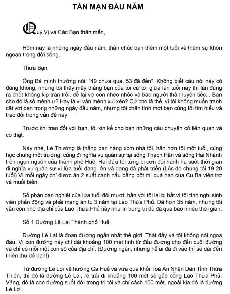 | XUÂN MẸ VÀ EM Quý Vị và Các Bạn thân mến, Sau bao nhiêu năm xa quê hương làm người tha phương, và hầu như mỗi khi Tết đến nơi tiểu bang tôi đang ở, cũng đều có tuyết rơi với khí hậu lạnh cóng da thịt. Có những đêm đang khi cúng Giao Thừa thì ngoài kia tuyết rơi trắng xóa, tuyết phủ khắp mái nhà, phủ cả lối đi… Những giây phút linh thiêng này, lòng tôi thường hướng về Quê hương và nhớ về những kỷ niệm xa xưa qua những lần đón Xuân. Ôi những kỷ niệm của những mùa xuân rộn ràng, nhộn nhịp, đoàn tụ và ấm áp làm sao! Những mùa xuân ấy có mẹ hiền thức khuya đun củi nấu bánh chưng, còn cha thì khăn đóng áo dài sửa soạn hương đèn cúng Giao thừa. Rồi rộn ràng có tiếng pháo nổ, có cây nêu cao ngất trời xanh… Còn nơi đây và trong khoảnh khắc này, tôi vẫn một mình âm thầm đón Giao thừa xa vắng và lạnh căm… “Ngoài kia tuyết trắng, tuyết trắng khắp mái nhà, đêm nay một mình đón Giao thừa ở tha phương, tôi buồn, tủi lòng cuộc đời phải xa cố hương” (Lời ca trong bài hát) Những giây phút này cho tôi cảm nghiệm với thêm nỗi niềm, những ray rứt và băn khoăn khôn vơi của một kiếp người đang sống xa quê. Tâm tư và nỗi niềm đó là nguồn cảm hứng để tôi viết lên ca khúc XUÂN MẸ VÀ EM – mà có thể đó cũng là tâm trạng của chính mỗi chúng ta đang khắc khoải mỗi khi xuân về. Ai đó đã nói: “Ở đâu có Mẹ hiền, ở đó có Quê hương” Vâng, phải lắm! Tôi luôn thầm ước và nguyện cầu cho Quê hương tôi và người dân luôn mãi có những mùa Xuân ấm no, hạnh phúc và thịnh vượng… và nơi đó giải đất hình chữ S suốt đời vẫn là quê hương của tôi dù mẹ tôi đã mất rồi! Xin chia xẻ bài hát XUÂN MẸ VÀ EM qua giọng hát của ca sĩ Duy Khánh và Video diễn ảnh do Minh Dương thực hiện theo đường link youtute sau đây: https://youtu.be/lPrYSeIwMp0 Nếu muốn hát karaoke bài hát này, xin bấm vào đây: https://youtu.be/OX1rgWQfe3g Cũng xin gửi bài hát Xuân Mẹ Và Em bằng PDF trong email này. Kính chúc Quý Vị và Các Bạn Năm Mới an khang, thịnh vượng và gặp nhiều may mắn trong cuộc sống dù đang ở hải ngoại hay quê nhà. Trân trọng, Văn Duy Tùng |