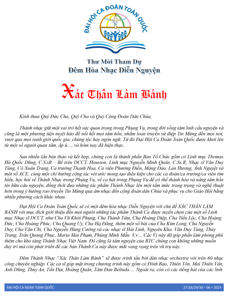 Kính mời quý độc giả bấm vào hình bìa ĐẠI HỘI CA ĐOÀN TOÀN QUỐC Đêm Diễn Nguyện XÁC THÂN LÀM BÁNH để xem chi tiết.