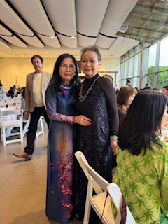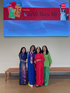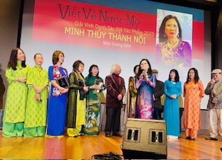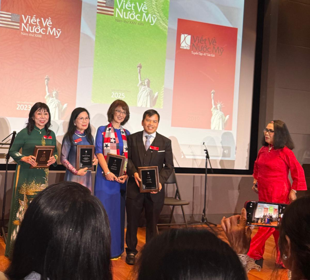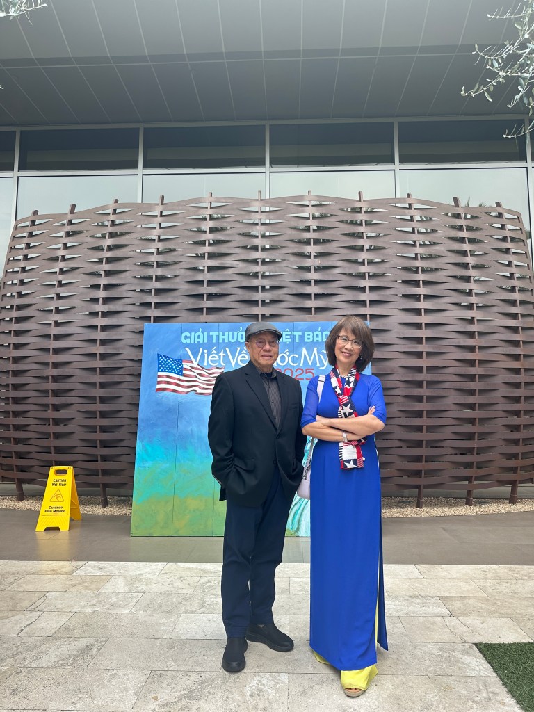 | Chị Cung Lan ơi, Cho em gửi bài tâm tình mới viết xong, có kèm tấm hình KimLoan chụp với nhà văn Trịnh Y Thư tại buổi trao giải VVNM 2025, Cám ơn chị, KimLoan TÂM TÌNH NGÀY PHÁT GIẢI VVNM 2025 Hồi tháng tám năm nay, khi Việt Báo mới thông báo những tác giả trúng giải VVNM (Viết Về Nước Mỹ) 2025, tôi liền gọi phone khoe ông xã dù biết chàng đang làm việc. Chàng trả lời tỉnh bơ: – Cuộc thi này coi bộ …dễ quá hả em? Tôi chưng hửng: – Anh nói vậy nghĩa là sao ? – Thì em dự thi ba mùa, 2021, 2023, và năm nay 2025, cả ba mùa đều trúng giải, không dễ thì là gì ?! – Ủa ? Ủa ? Hello ?! Không biết chàng thờ ơ hay đang bận tiếp khách hàng đến tiệm mua thuốc mà chẳng thấy trả lời! Chẳng lẽ nào chàng chỉ nói đùa, và có ý vừa khen vừa …mỉa mai tôi? Còn thằng rể Canada da trắng (và thích ăn đồ Việt Nam) thì xuýt xoa nói với tôi, đại khái là: – Wow! Wow! Mom là người ở Canada, mà viết về nước Mỹ, lại được giải ba mùa liên tiếp, thật là quá tuyệt vời! Cái thằng! Bộ mày tưởng má mày hổng biết, tụi Tây, mở miệng ra khen ai là khen tới trời mây, dùng từ khuếch đại quá đáng, ai tưởng thiệt thì ráng chịu nghen . Lúc này, con gái tôi, là vợ thằng Canada da trắng khoái ăn đồ Việt bèn xía vô: – Ôi, vậy là anh không biét đó thôi! Chớ nếu có cuộc thi Viết Về Nước …Mễ thì má em cũng dám thi lắm á, vì má nổi tiếng là …điếc hổng sợ súng! Coi kìa, cái miệng con nhỏ tía lia, giống ai vậy cà! Mà nó nói cũng …không sai. Hồi mùa giải 2021, nghe lời “xúi dại” của nhỏ bạn bên Seattle kêu tôi gửi bài dự thi VVNM, tôi đồng ý cái rụp mà không cần tìm hiểu thể lệ cuộc thi, bởi tôi nghĩ, tôi mê nước Mỹ từ khi còn bé, thời VNCH rồi cơ, giờ chỉ việc viết ra, dễ như ăn cơm sườn, mặc dù ông xã tôi là người nghi ngại, cản trở, phản đối, người ta thi Viết Về Nước Mỹ, em ở Canada “với” tay qua bển, chắc gì “ăn” ai? Vậy mà tôi trúng giả Đặc Biệt. Nhưng tôi không thể tham dự nhận giải vì ba tôi mất (95 tuổi) ngay dư âm mùa dịch năm đó . Tưởng tôi sẽ không thi nữa, ông xã nửa thật nửa đùa nói khích, hỏi tôi còn đề tài VVNM nữa không . Mà cái tánh của tôi, hễ ai khích là tôi càng làm cho bằng được, thế là tôi lại tiếp tục và lần giải 2023 tôi được nhảy hạng lên giải Vinh Danh Tác Phẩm, hay còn gọi là Á Hậu, oai quá đi mất! Tôi vui vẻ háo hức đi lãnh giải VVNM 2023, thật là một ngày vui trọn vẹn, được gặp gỡ quen biết những tác giả, những văn thi sĩ xưa nay chỉ biết qua mạng và qua báo chí. Dư âm còn vấn vương trên chuyến bay về nhà Canada, tôi cao hứng nói với ông xã: – Anh ơi, VVNM riết làm mình …ghiền đó anh, em sẽ …viết nữa, thi nữa! Biết là không cản được tôi, chàng liền gật đầu để gia đình …yên ấm, và một lần nữa tôi lại may mắn, tôi khăn gói lên đường bay qua Santa Ana, California tham dự buổi phát giải VVNM 2025 vào ngày Nov 30 vừa qua . Nếu như mùa VVNM 2023 tôi còn …ngơ ngác, rụt rè như “con nai vàng” vì lúc ấy chưa quen biết ai, cứ lo dáo dác đi tìm người này người kia để …bắt quàng làm họ, chẳng còn tâm trí thưởng thức những món ăn Việt Nam rất ngon mà chị Hằng Nguyễn đã chuẩn bị thật bắt mắt . Lần này tôi đến sớm cả tiếng đồng hồ, trước là để chụp hình trong khuôn viên Bowers Museum quá đẹp, rồi đi vào trong Museum thưởng lãm những bức tranh đủ loại dù tôi chẳng am hiểu gì về hội họa nhưng đã thật sự thích thú vô cùng, sau đó trở lại nơi phòng tiếp tân VVNM, ký tên vào sách như thông lệ . Xong xuôi, tôi tìm vào bàn của mình, rồi đi lấy cafe, và bắt đầu thong thả đi vòng vòng chào hỏi, nói chuyện, chụp hình với mọi người quen cũ hoặc mới quen, vui rộn ràng. Đặc biệt năm nay có phần Ra Mắt Sách “Người Mỹ Và Tôi” của chị Trương Ngọc Bảo Xuân, đúng dịp 50 Năm Tha Hương và 25 Năm VVNM, khi mà chính chị từng đoạt giải Quán Quân VVNM và trở thành chánh chủ khảo VVNM nhiều năm nay. Những người từng đọc truyện của chị Bảo Xuân chắc cũng đồng ý với tôi, chị viết như …thở, dễ ợt à, mà dòng văn chương tuôn ra êm ái, ngọt như đường cát mát như đường phèn như giọng nói Nam Kỳ của chị vậy đó . Chúc mừng chị Xuân có được cuốn sách để đời, kỷ niệm không những với “người Mỹ của chị” mà với cả Sài Gòn trải dài theo những năm tháng an bình cho tới loạn ly, thất thủ vào tay Cộng Quân, và những hành trình mới trên đất Mỹ yêu thương. Năm nay, VVNM được trao giải tại Bowers Museum, không gian tiếp đón và ăn trưa rất rộng rãi, thoáng mát, sáng sủa, so với không gian khá hạn hẹp của lần VVNM 2023 . Phần thức ăn luôn là “điểm son sáng chói” của ban tổ chức, mọi người thưởng thức bữa trưa, gọi nhau chuyện trò, qua lại chụp hình lưu niệm cùng nhau, tạo nên một khung cảnh nhộn nhịp đáng yêu vô cùng . Phần hai, là phần trao giải xen kẽ nhạc thính phòng tại Auditorium của Bower