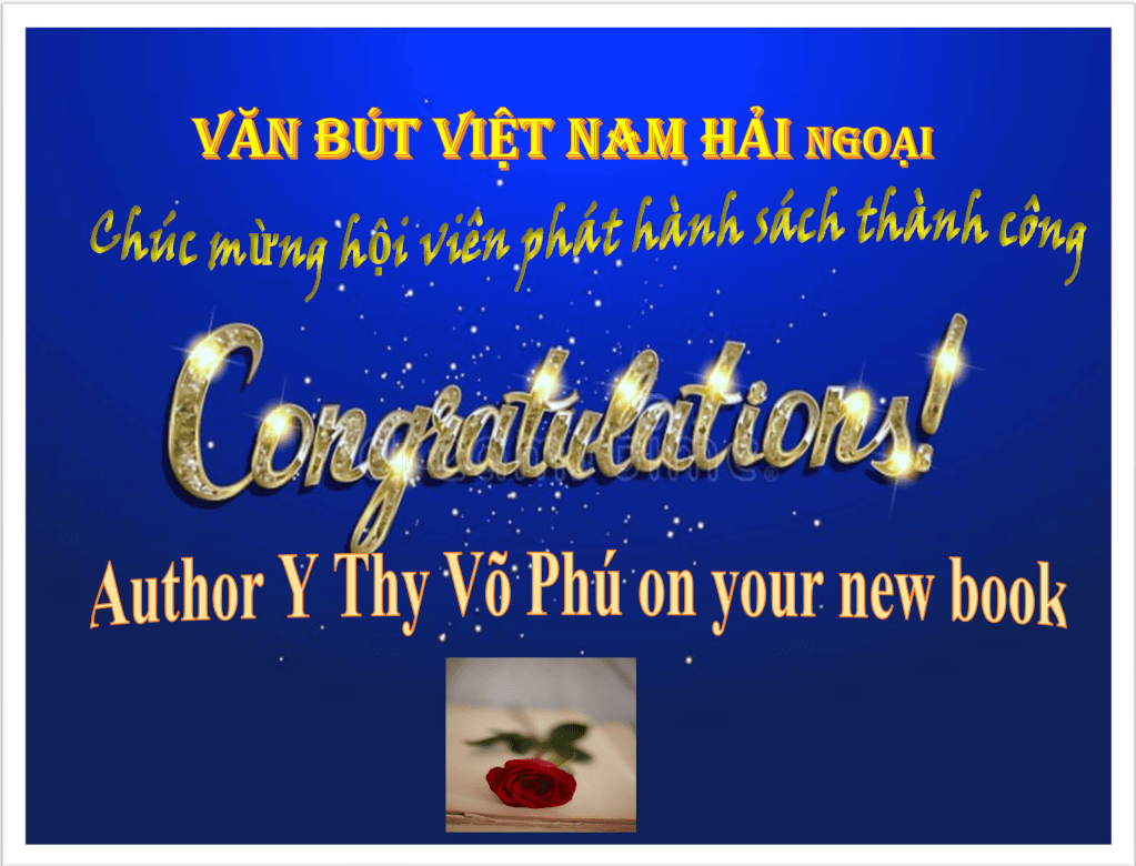| Dạ Y Thy Võ Phú xin cám ơn chủ tịch VBVNHN Cung Thị Lan đã giúp Y Thy Võ Phú rất nhiều để buổi Ra Mắt Sách được thành công mỹ mãn. Cám ơn chủ tịch VBVNHN Cung Thị Lan đã gửi thư mời quý văn thi hữu trong VB cũng như làm diễn giả để giới thiệu về Y Thy Võ Phú đến độc giả. Cám ơn anh Hiệp Phạm đã ghi lại hình ảnh giúp em… Cám ơn quý cô chú bác hội viên VB đã đến tham dự và chung vui cùng Y Thy. Xin kính cảm ơn chủ tịch VBMÐ nhà văn Hồng Thủy, nhà văn Lê Thị Nhị, nhà văn Lê Tống Mộng Hoa, nhà văn Trịnh Bình An, văn thi sĩ Thái An, văn thi sĩ Thúy Messegee, văn thi sĩ Lê Mỹ Hoàn, văn sĩ Ngọc Hạnh, nhà thơ Ðăng Nguyên…vv…vv… đã đến chung vui cùng Y Thy Võ Phú và gia đình. Y Thy Võ Phú cũng xin cám ơn quý văn, thi, nhạc sĩ ở phương xa đã gửi email, gọi điện thoại, để tin nhắn chúc mừng trong ngày RMS. Một lần nữa, Y Thy Võ Phú xin chân thành cám ơn tất cả quý văn thi hữu trưởng thượng. Xin kính chúc quý vị thân tâm thường an lạc và sức khỏe… Kính thư, Y Thy Võ Phú |