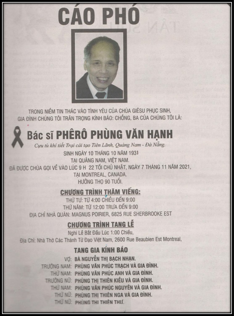 | THÀNH KÍNH PHÂN ƯU CÙNG GIA ĐÌNH NHÀ VĂN KHÁNH GIAO PHÙNG VĂN HẠNH NGUYÊN BÁC SĨ QUÂN Y TỔNG Y VIỆN DUY TÂN ĐÀ NẴNG NGUYÊN GIÁM ĐỐC BỆNH VIỆN TƯ PHÙNG VĂN HẠNH ĐÀ NẴNG , MÃN PHẦN TẠI CANADA , ĐẠI THỌ 90 NIÊN TUẾ ( 1931 – 2021 ) . THÀNH KÍNH NGUYỆN CẦU LINH HỒN NHÀ VĂN BÁC SĨ SỚM PHIÊU DIÊU VỀ CÕI VÔ CÙNG . TRÂN TRỌNG BÁI BIỆT . CAO MỴ NHÂN ( QĐI/ QKI – ĐÀ NẴNG ) Hội Viên VĂN BÚT VÙNG ĐB HOA KỲ . |