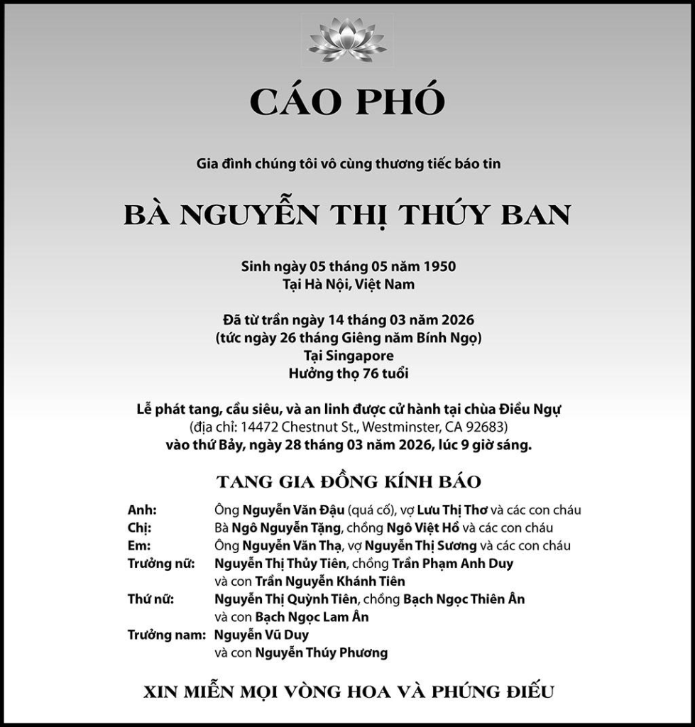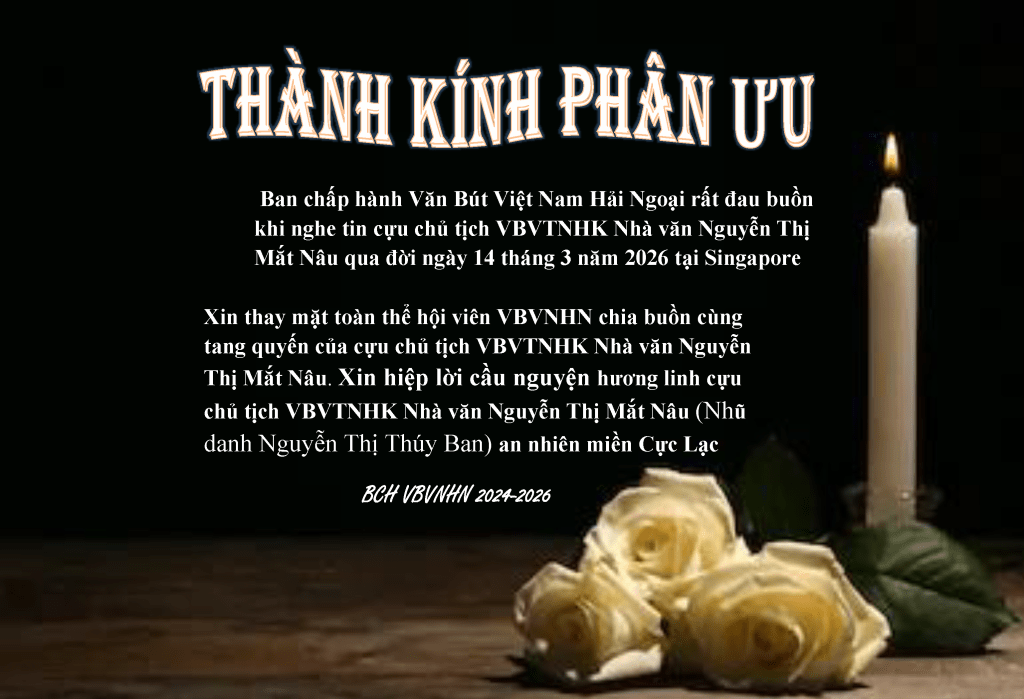 | *CHÚNG TÔI VỪA NHẬN ĐƯỢC TIN: [do thân nhân của nhà văn NGUYỄN THỊ MẮT NÂU thông báo] : **NHÀ VĂN NGUYỄN THI MẮT NÂU [nhũ danh NGUYỄN THỊ THÚY BAN] -***Sinh ngày 05 tháng 05 ,năm1950, tại Hà Nội. Việt Nam – Đã từ trần ngày.14 tháng.03 năm 2026 [tức ngày 26 tháng Giêng, năm Bính Ngọ].Tại Singapore. Hưởng thọ 76 tuổi. ****Lễ phát tang, cầu siêu, và an linh được cử hành tại chùa Điều Ngự (địa chỉ :14472 Chestnut St., Westminster, CA 92683) vào thứ Bảy, ngày 28 tháng 03 năm 2026, lúc 9 giờ sáng. *****Chúng tôi :”Cầu chúc hương linh nhà văn NGUYỄN THỊ MẮT NÂU sớm được siêu thăng về miền lạc cảnh “, và chân thành chia buồn cùng bà Ngô Nguyễn Tặng [chị ruột}, ông Ngô Việt Hồ [anh rể]. cùng tang quyến. Nguyễn Hải Hà |