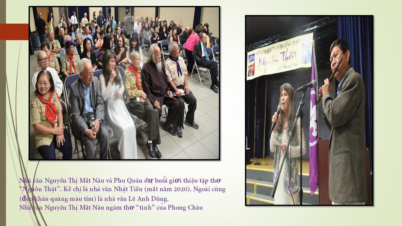 | Vừa đi xa về Nghe tin nhà văn Nguyễn Thị Mắt Nâu đã vĩnh viễn từ bỏ thế gian Phong Châu có duyên được gặp nhà văn Nguyễn Thị Mắt Nâu hai lần tại Nam California Lân thứ nhất, tháng 10 năm 2018 Phong Châu sang California để giới thiệu tập thơ Hướng Đạo “Nguồn Thật”. Nhà Văn Nguyễn Thị Mắt Nâu chẳng những nhận lời mời đến dự mà còn diễn ngâm một số bài thơ “tình” của Phong Châu. Giọng ngâm của chị sâu lắng trầm buồn như dòng thơ. Giọng nói của chị nhẹ nhàng, từ tốn nhưng đầy nhiệt tâm. Chị có tặng cho Phong Châu bộ sách “Xã Hội Việt Nam Xưa Và Nay gồm 12 tập” và tập truyện “Giọt Lệ Cho Từ Bi”. Đến dự còn có mặt vị Phu Quân của chị. Lân thứ hai, tháng 7 năm 2024 khi Phong Châu sang California dự tang lễ của anh Hoàng Ngọc Tuệ, chủ tịch Phong Trào Du Ca Việt Nam. Chị đến dự một mình, Phong Châu có hỏi đến phu quân của chị thì chị cho biết là anh đã mất. Thật buồn. Dịp này chi tặng cho Phong Châu cuốn “Khốn Nạn” xuất bản năn 2023. Trang đầu có ghi câu “Không KHỐN NẠN, không cấu thành xã hội, và có thể khiến đời bớt đi màu sắc…” Mắt của chị Màu Nâu nên có lẽ vì thế mà chị lấy bút hiệu “Nguyễn Thị Mắt Nâu” chăng? Vô cùng mến và thương tiếc chị Nguyện xin hương linh nhà văn Nguyễn Thị Mắt Nâu sớm được vào Cõi Niết Bàn Phong Châu Ngày 4 Tháng tư, 2026 ![]() |