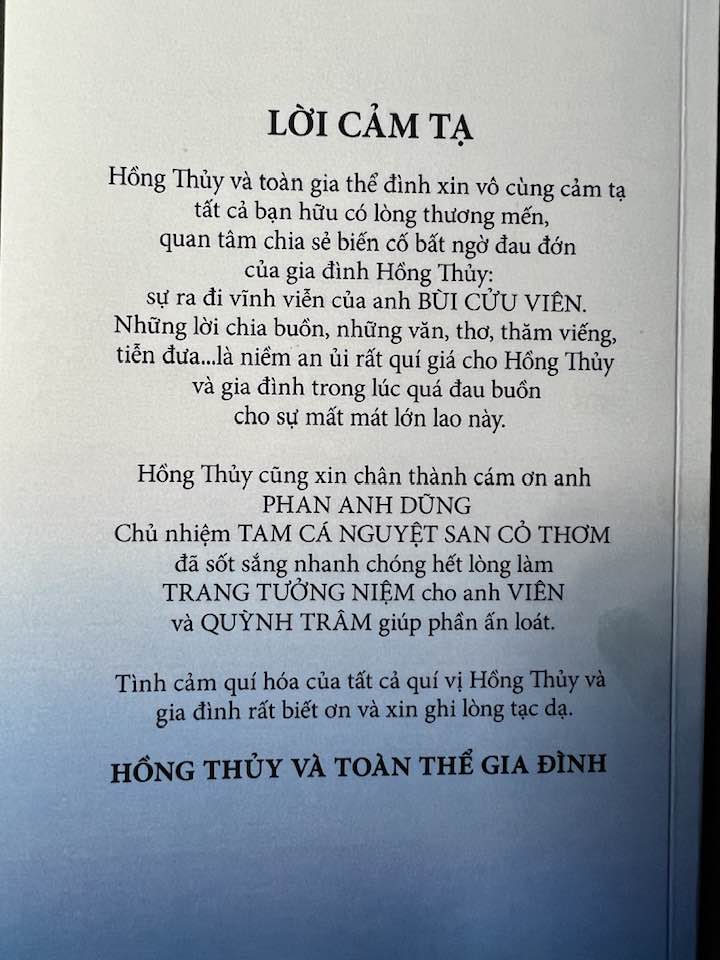 | Anh BÙI CỬU VIÊN ra đi đúng vào mùa Chúa Sống Lại ! Chắc Chúa Quan phòng và đưa Linh Hồn anh Cửu Viên về Bên Chúa luôn rồi . Bớt buồn để giữ sức khoẻ nhé Hồng Thủy bây giờ vừa Làm Mẹ – Làm cha cho các con và làm bà của Các Cháu nữa . CÒN một vai lo Hội Thơ . Mình xin chia xẻ với Hồng Thủy nhé và chúc Hồng Thủy sẽ làm thơ Tình hay …- Kinh nghiệm Thư Khanh sau khi Chồng Chết mới sống thực với thơ Tình . Vì sự mất mát to lớn qúa !!!! THƯ KHANH Trăm năm đâu có dài là mấy . Anh đã ra đi – đi thật rồi . Cầu Xin Chúa cứu Linh Hồn lẹ . Về ở Cùng Ngài – ” Lạy Chúa Tôi “ A Men . – THƯ KHANH – Seattle -4/12/2023 ![]() |