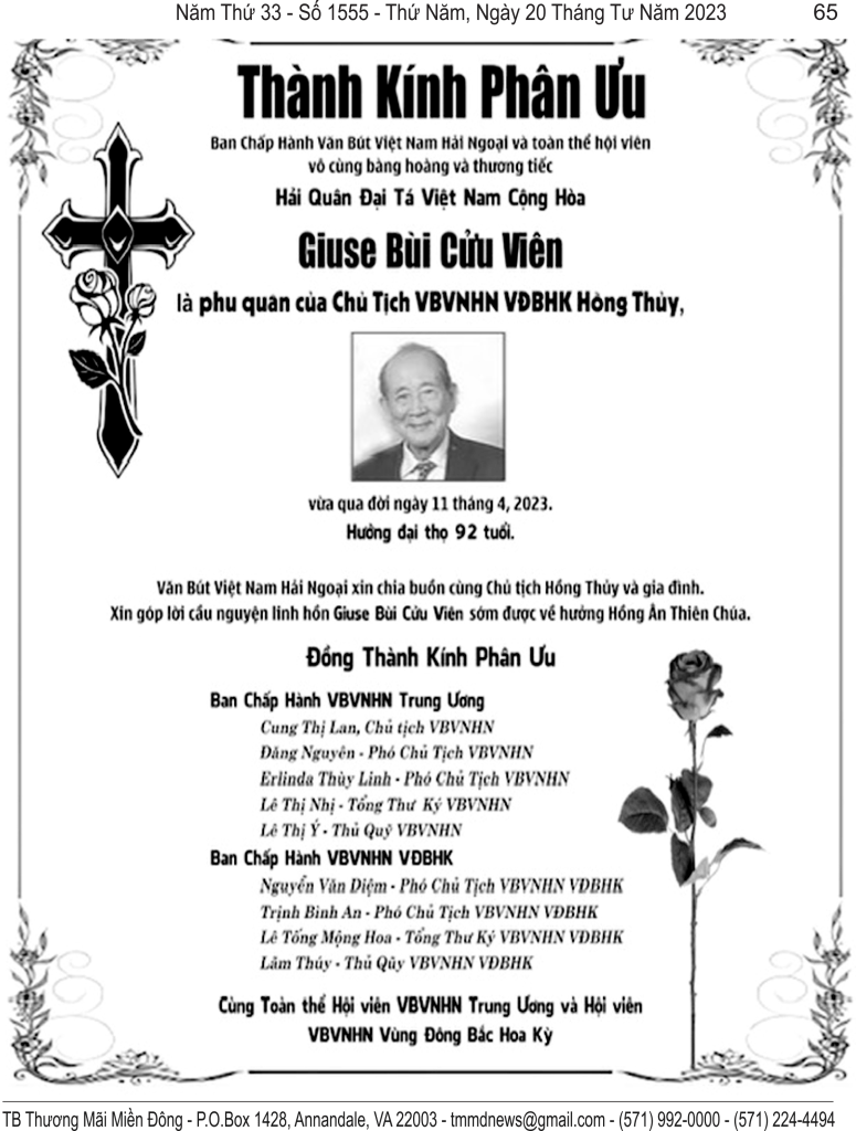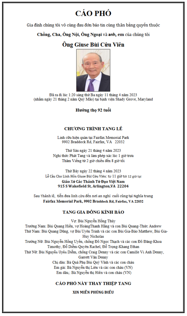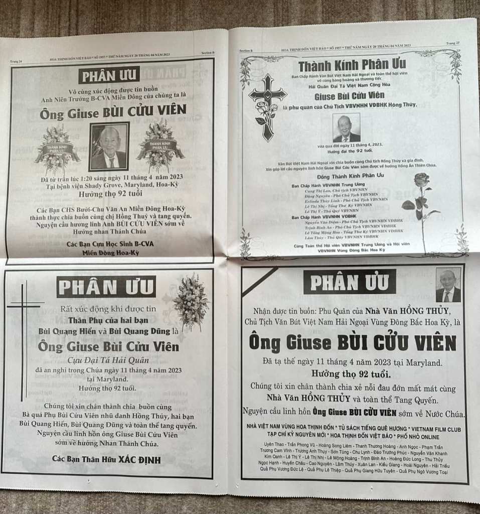 | VÔ CÙNG THƯƠNG TIẾC ANH BÙI CỪU VIÊN ! CỰU ĐẠI TÁ HẢI QUÂN 1932 – 2023 THÀNH KÍNH DÂNG ANH NGÀN NÉN HƯƠNG ĐAU BUỒN ! ANH BIỆT CHỐN THA PHƯƠNG GIA ĐÌNH, BẰNG HỮU SẦU THƯƠNG TIẾC ANH HỠI ! THẤU CHĂNG NỖI ĐOẠN TRƯỜNG ĐẠI GIA ĐÌNH CHÚNG EM : JEFFREY & CHÚC ANH MILLER LOS ANGELES APRIL 11, 2023 |