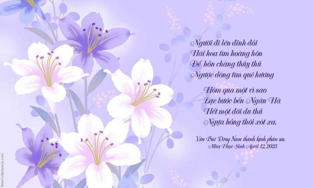 | Ngàn Trùng Vĩnh Biệt Ngàn trùng Vĩnh biệt từ đây Nghe tin Anh mất buồn vây bốn bề Anh ra khơi mãi không về ! Gia đình bạn hữu não nề sầu bi Nửa đêm về sáng Anh đi Bình minh chợt tối âm ti tới giờ ? Âm Dương xa cách đâu ngờ ! Đêm Xuân lạnh giá sương mờ giăng giăng Trên trời còn nửa vầng trăng ! Nửa kia đã khuất phải chăng vắng “Người “ Mùa Xuân hoa thắm kém tươi ! Bạn đời sầu úa nhớ “Người “ ủ ê ! Có Thơm văn hữu tái tê! Tiễn biệt Anh dạ lê thê buồn ! Anh đi như nước về nguồn Trời xanh nước biếc Thiên Đường thênh thang ! Những ngày họp mặt ca vang Tiếng Anh cười nói oang oang khắp phòng Tiếc thương Anh lệ lưng tròng ! Vượt qua năm tháng long đong ? Giáng sinh lễ Hội chờ mong muôn người ! Anh luôn vui vẻ tươi cười Chu toàn tổ chức hơn mười năm qua ! Nhớ ngày hội ngộ hoan ca Vắng Anh bạn hữu sót sa im lìm ! Như bình minh vắng tiếng chim ! Xuân không hoa thắm biết tìm vui đâu? Đời người dài có bao lâu? Tuổi vàng Đại thọ hát câu mong chờ? Trùng dương miên viễn vô bờ? Anh người “Hạm Trưởng bất ngờ “ cứu nhân! Cuộc đời như thể phù vân? Phân ly tử biệt “xa luân vô thường “ Chú văn An Bưởi Trưng Vương, Đồng môn thân mến tiếc thương vô vàn! Anh người chiến hữu hiên ngang! Tình nhà nợ nước đảm đang chu toàn! Nguyện cầu Anh tới Thiên Đàng Hồn Anh thanh thản mây ngàn khắp nơi Thái Hưng/Phạm Gia Hưng Hưng và Khuê Hương cùng các Anh Chị : Võ Thế Hào (Paris) Phạm Kế Viêm & Trần Diệu Tâm (Paris) Anh Chị Nguyễn Đăng Quế (Paris) Trần Lâm & Hoàng Thu Liêm (SJ California) Phạm Thịnh & Vũ Hà (Virginia) Xin chia buồn cùng chị Hồng Thủy và tang quyến |
