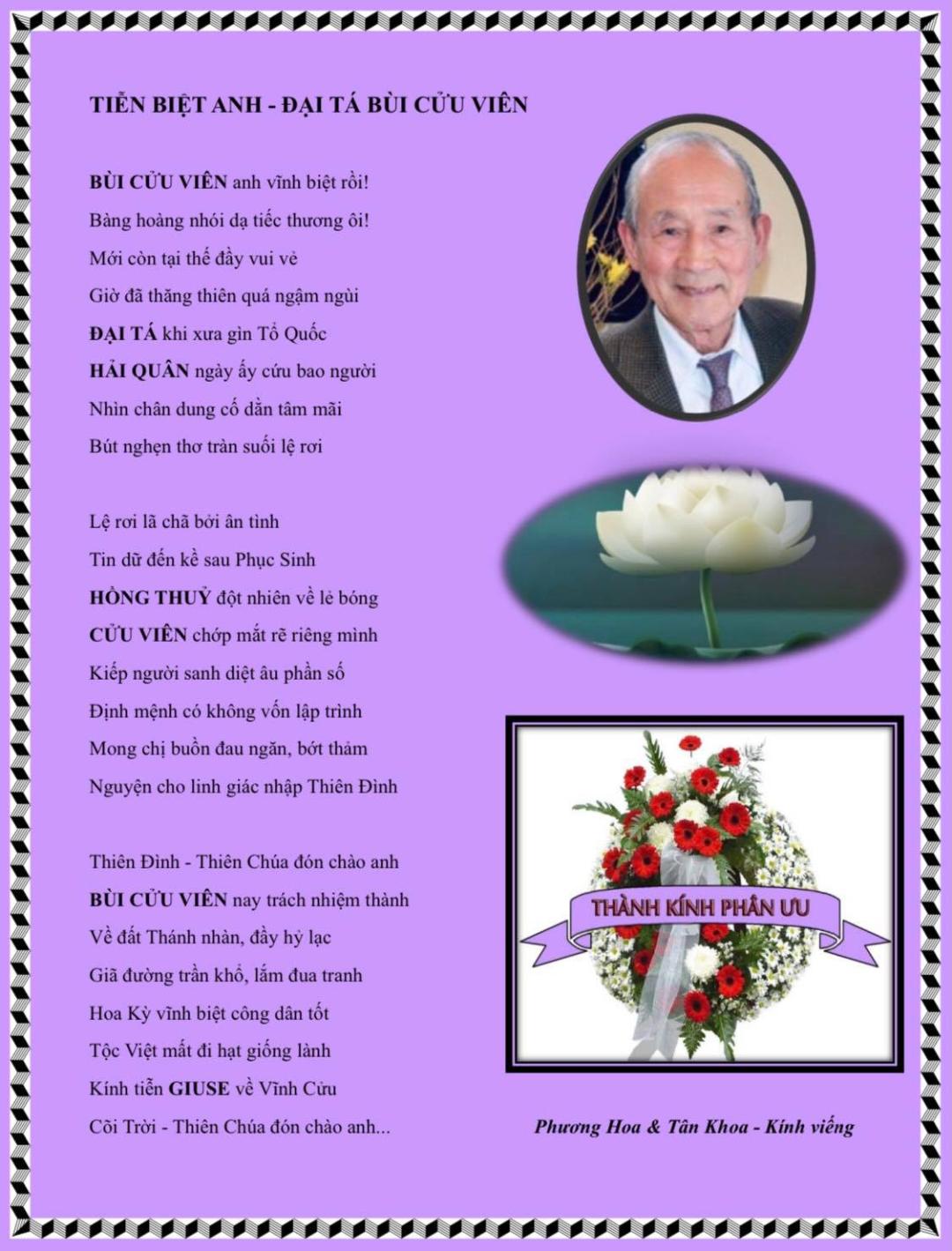 | CÁM ƠN CHỦ TỊCH VBVNHN CUNG LAN ĐÃ DÀNH TRANG CHIA BUỒN CHO GIA ĐÌNH CHỊ HỒNG THỦY. Thật quá bất ngờ, và đau lòng khôn tả, cho Phương Hoa và nhóm bạn từ Cali bay qua tuần trước. Anh Cửu Viên còn vui vẻ nhanh nhẹn lái xe đi phi trường đón mọi người. Những buổi tối cả nhóm đi chơi về, anh Viên vẫn vui vẻ cùng mọi người ăn tối, trò chuyện, nghe hát Karaoke, uống rượu vang, nghe chuyện tiếu lâm Hoàng Dung kể và cười đến …vỡ nhà. Nhưng sao đời lại vô thường đến thế? Có đó rồi mất đó, chỉ trong phút chốc là anh đã vĩnh viễn ra đi! Thương quý anh Cửu Viên khôn cùng! Lại càng thương yêu chị Hồng Thủy vô vàn… CHỊ HỒNG THỦY ƠI! HÃY CỐ LÊN! MỌI NGƯỜI VÀ EM LUÔN Ở SAU LƯNG CHỊ!😍😍😍😍😍 Thay mặt gia đình, Phương Hoa em xin thành kính chia buồn cùng chị Hồng Thủy và toàn thể Bùi Gia. Kính thành tâm nguyện cầu cho anh Giuse BÙI CỬU VIÊN được sớm về hưởng nhan Thánh Chúa. ![]() TIỄN BIỆT ANH – ĐẠI TÁ BÙI CỬU VIÊN BÙI CỬU VIÊN anh vĩnh biệt rồi! Bàng hoàng nhói dạ tiếc thương ôi! Mới còn tại thế đầy vui vẻ Giờ đã thăng thiên quá ngậm ngùi ĐẠI TÁ khi xưa gìn Tổ Quốc HẢI QUÂN ngày ấy cứu bao người Nhìn chân dung cố dằn tâm mãi Bút nghẹn thơ tràn suối lệ rơi Lệ rơi lã chã bởi ân tình Tin dữ đến kề sau Phục Sinh HỒNG THUỶ đột nhiên về lẻ bóng CỬU VIÊN chớp mắt rẽ riêng mình Kiếp người sanh diệt âu phần số Định mệnh có không vốn lập trình Mong chị buồn đau ngăn, bớt thảm Nguyện cho linh giác nhập Thiên Đình Thiên Đình – Thiên Chúa đón chào anh BÙI CỬU VIÊN nay trách nhiệm thành Về đất Thánh nhàn, đầy hỷ lạc Giã đường trần khổ, lắm đua tranh Hoa Kỳ vĩnh biệt công dân tốt Tộc Việt mất đi hạt giống lành Kính tiễn GIUSE về Vĩnh Cửu Cõi Trời – Thiên Chúa đón chào anh… Phương Hoa & Tân Khoa – Từ California – Kính viếng |