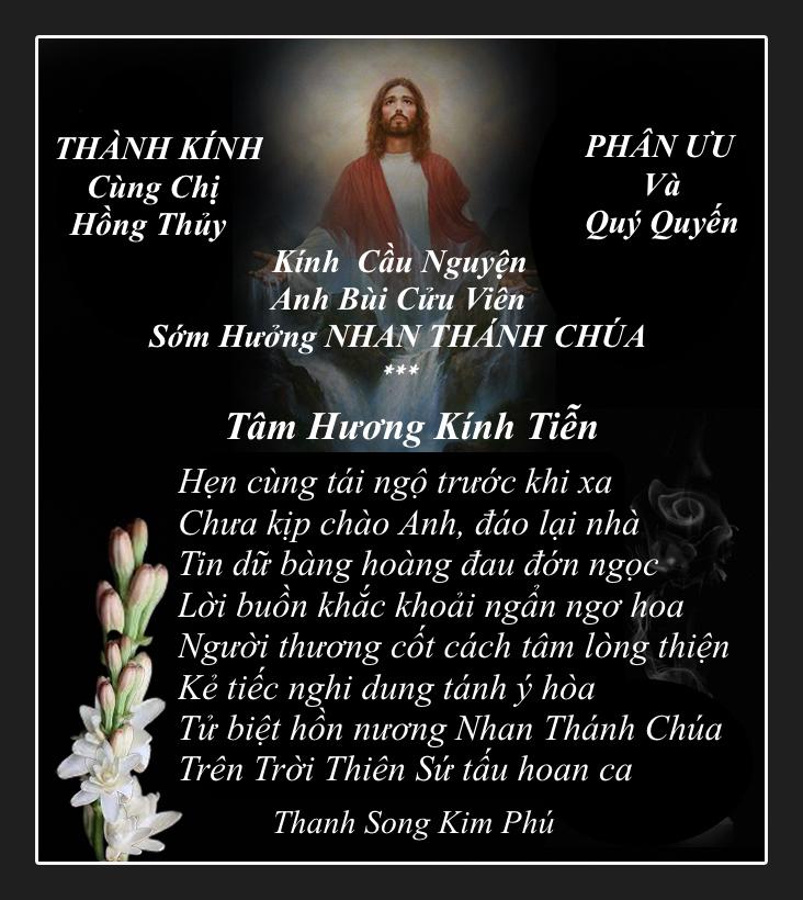 | Thành kính phân ưu và cầu nguyện linh hồn Giuse đại tá Bùi Cửu Viên thảnh thơi nơi nước Chúa Chương Hà |
