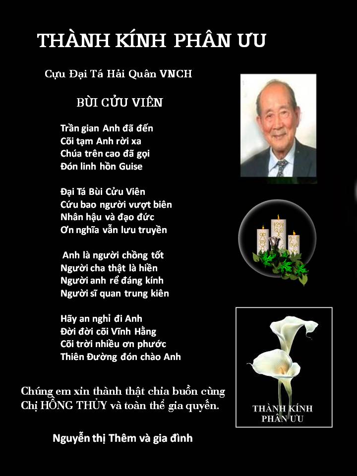 | Thành Kính Chia Buồn Cùng gia đình ban Hồng Thủy về tin buồn của Phu Quân là Cựu Đại Ta Hải Quân Bùi Cứu Viênvừa qua đời. Quen biết từ lâu, và gặp Anh Viên và Hồng Thủy nhiều lần tại Cali. Luc nào anh cũng hiền hòa trò chuyện cùng các anh chị em. Kinh chúc linh hồn Giuse Bùi Cứu Viên sớm được về nước Thiên Đàng Lê Nguyễn Nga VBVNHN . TN |