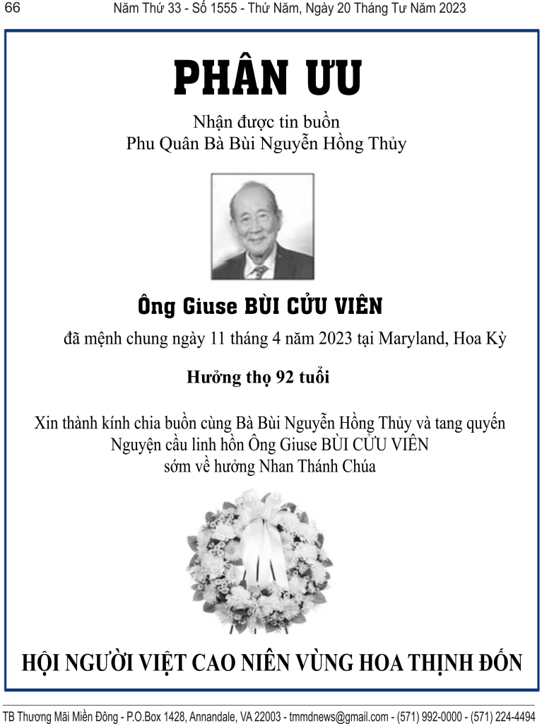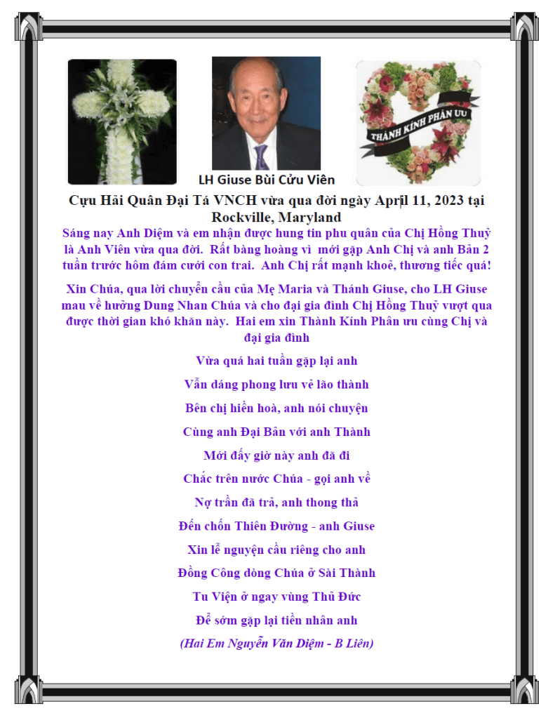 | PHÂN ƯU Vô cùng xúc động khi hay tin: ANH GIUSE BÙI CỬU VIÊN Cựu Đại Tá Hải Quân _VNCH PHU QUÂN của chị HỒNG THỦY Vừa từ trần ngày 11 tháng 4, năm 2023 tại MARYLAND, HOA KỲ. Kính xin chia xẻ nỗi mât mát lớn lao nầy với Chị HỒNG THỦY,các cháu và tang quyến. Xin thành tâm góp lời nguyện cầu THIÊN CHÚA độ trì, dắt dẫn LINH HỒN GIUSE BÙI CỬU VIÊN được thanh thản về NƯỚC CHÚA CÁC BẠN BAN CHÂP HÀNH VĂN BÚT VIỆT NAM HAỈ NGOAI VÙNG ĐÔNG BẮC HOA KỲ NGUYỄN VĂN DIỆM-TRỊNH BÌNH AN-NGUYỄN LÃM THÚY-LÊ TỐNG MỘNG HOA LE TONG MONG HOA |