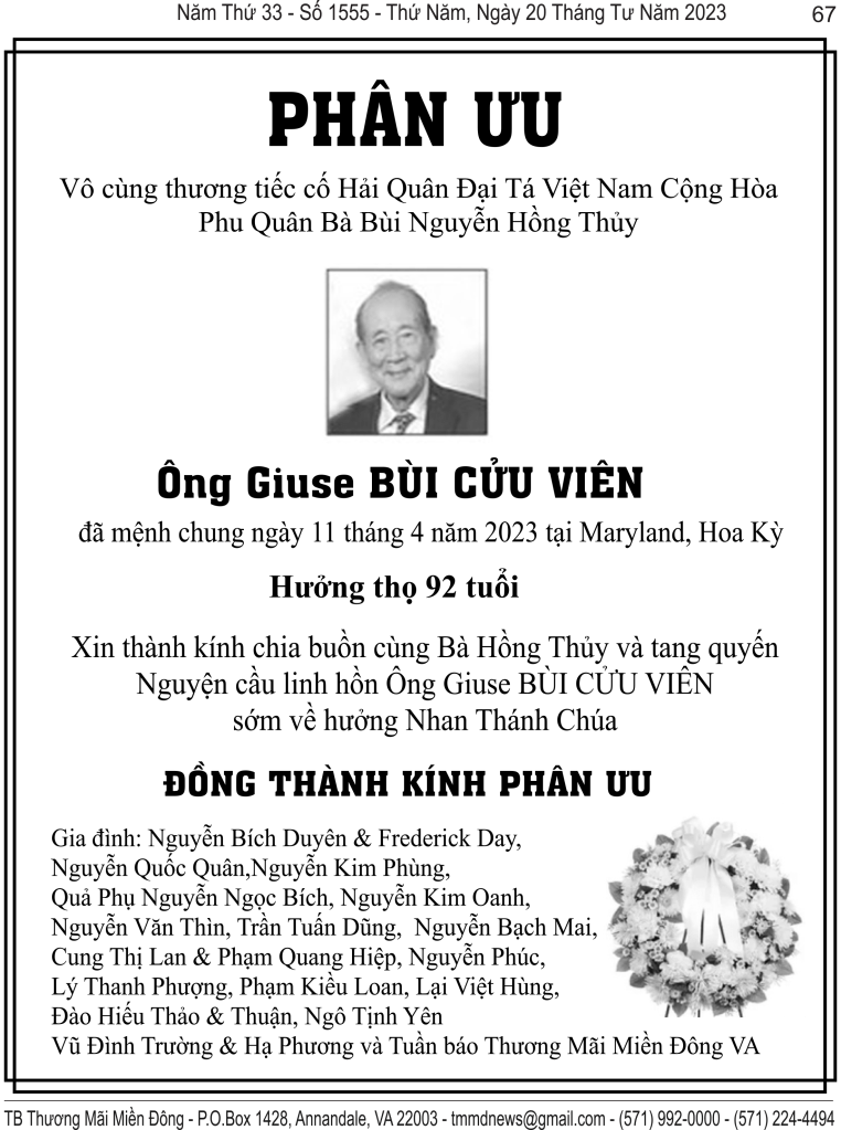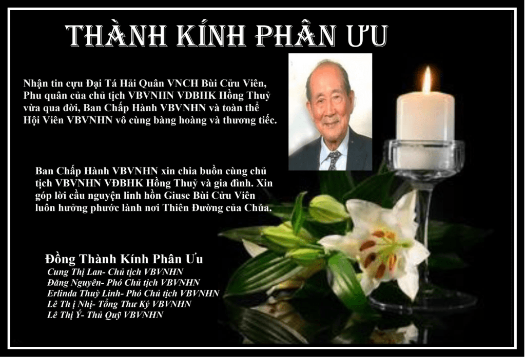 | THÀNH KÍNH PHÂN ƯU Thưa chị Hồng Thuỷ Chúng em vô cùng đau buồn và thương tiếc khi biết tin: Cựu Đại Tá Hải Quân QLVNCH BÙI CỬU VIÊN , Phu Quân của CHỊ đã ra đi Vĩnh viễn sáng ngày 11 tháng 4 năm 2023 tại Rockville, Maryland . Ý Nhi và gia đình xin thành kính phân ưu cùng chị và tang quyến. Cầu xin Thiên Chúa đón nhận Hương Linh Đại Tá Hải Quân BÙI CỬU VIÊN sớm yên nghỉ trên nước Thiên Đàng. Trân Trọng Ý Nhi |