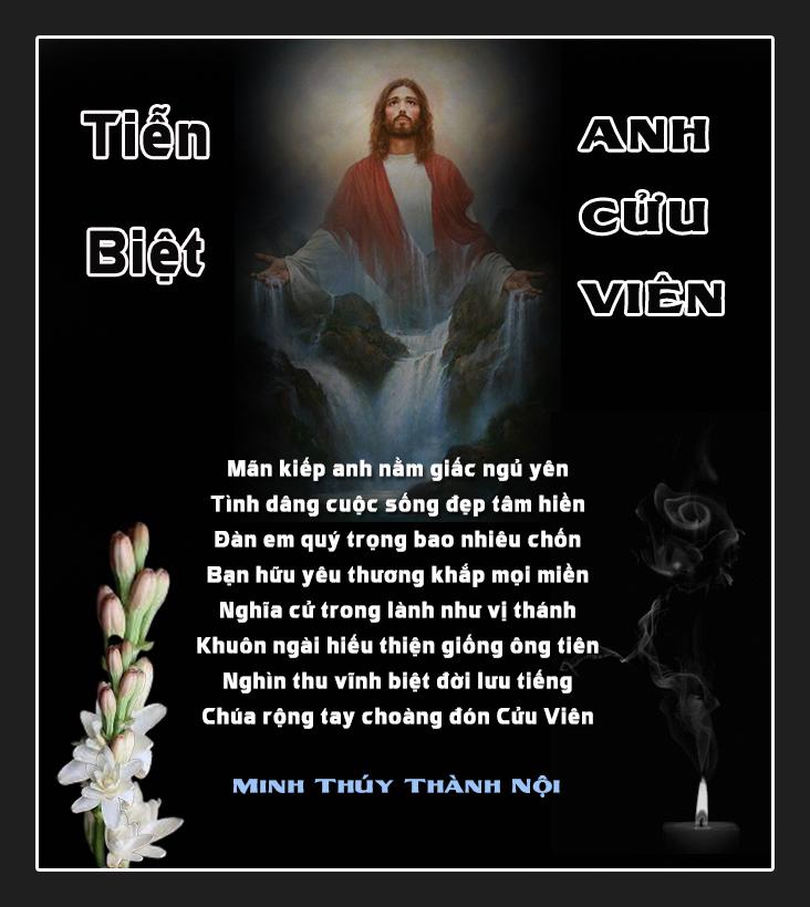 | Kính cầu nguyện anh Bùi Cửu Viên sớm hưởng nhan Thánh Chúa . Xin chia buồn đến gia đình chị Hồng Thuỷ , mong chị giữ gìn sức khỏe. Tiễn Biệt Anh Cửu Viên Mãn kiếp anh nằm giấc ngủ yên Tình dâng cuộc sống đẹp tâm hiền Đàn em quý trọng bao nhiêu chốn Bạn hữu yêu thương khắp mọi miền Nghĩa cử trong lành như vị thánh Khuôn ngài hiếu thiện giống ông tiên Nghìn thu vĩnh biệt đời lưu tiếng Chúa rộng tay choàng đón Cửu Viên Minh Thúy Thành Nội Tháng 4/10/2013 |