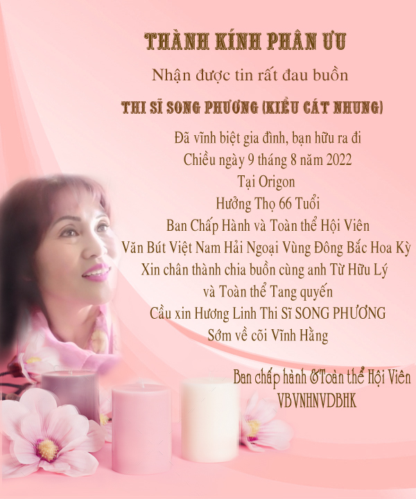 | Phân ưu Nhận được tin buồn Nữ thì sĩ SONG PHƯƠNG đã vĩnh viễn rời xa chúng ta. Trước sự đau buồn quá lớn lao nầy. Ban chấp hành và Văn Thi Hữu văn bút Việt Nam hải ngoại/vùng Nam Hoa Kỳ, thành kính chia buồn cùng gia đình Nữ Thi Sĩ SONG PHƯƠNG và toàn Đại tang quyến. Nguyện cầu Hương linh Nữ Thi Sĩ SONG PHƯƠNG sớm về miền Lạc cảnh. Cù Hoà Phong Lê Hữu Liệu Phan đình Minh Lê hữu Minh Toán Đặng Toản Đồng Thành Kính Phân Ưu! |