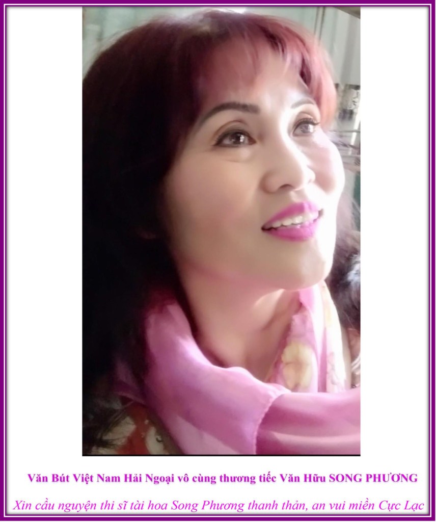 | Tuần vừa qua theo các chị đi tập văn nghệ cho ngày lễ Vu Lan, tuy chỉ đi để cổ động rồi ra hội cao niên, gặp nhiều người già, thấy mọi người sinh hoạt được cũng mừng, nhưng thật là bàng hoàng nghe chị HT báo tin Song Phương đã bỏ hội Văn Bút ra đi, SP còn trẻ quá, thật là ai cũng thương tiếc một thi sĩ trẻ tài hoa, cầu mong Song Phương được yên nghỉ. Chân Thành chia buồn cùng tang quyến, xin Kính nguyện hương linh thi sĩ Song Phương sớm được về nơi cõi Niết Bàn. Mỹ Hoàn |