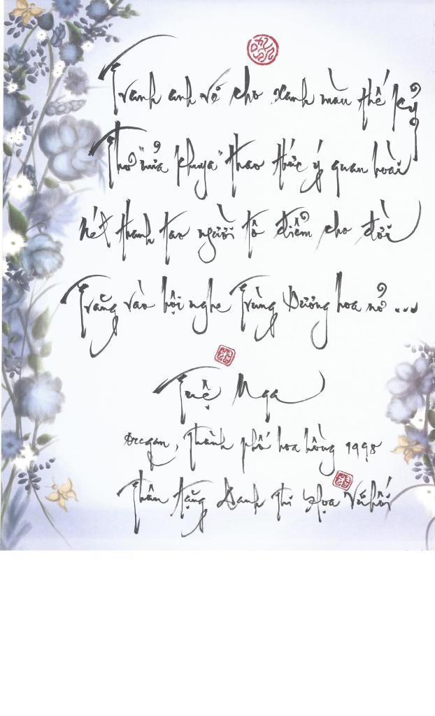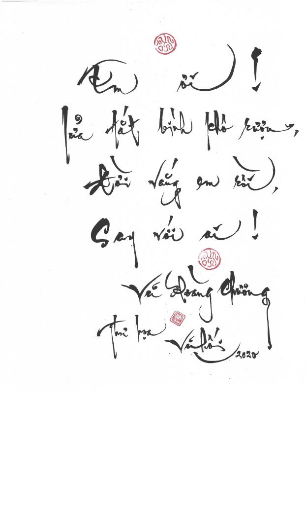 | Lãng Đãng Cõi Thơ Chút gì trong nắng phù du À ơi!… đứt ruột lời ru Mẹ hiền Chút gì lảo đảo cành nghiêng Nhớ cha vời vợi, khối miên man sầu Chút gì trong sóng bể dâu Mặn môi son nhạt vạn câu đoạn trường Chú gì giữa cõi tuyết sương Giá băng tim lạnh, phố phường ngủ yên Chút gì đắng giọt lệ huyền Vàng tay khói trắng lạc miền cô đơn Chút gì trong gió chập chờn Đèn khuya soi bóng cầu vòng tử sinh Chút gì nghiệt ngã điêu linh Sao đành câm nín lặng thinh giữa đời…? Chút gì bàng bạc mây trời Sử xanh ấn tượng một thời đã qua Chút gì trong mắt nhạt nhòa Mù tăm mồ mẹ, la đà gió bay Chút gì thao thức miệt mài Gò xưa ngủ với hình hài cha ông Chút gì réo gọi ngàn thông Lời thề buổi ấy, núì sông đợi chờ Chút gì lãng đãng cõi thơ Cố nhân hun hút, ngẩn ngơ người còn Chút gì còn với mỏi mòn Liêu trai hư thực, vuông tròn trong tranh Chút gì đáy cốc long lanh Rằng đây vẫn gọi… âm thanh cõi về Chút gì huyễn mông lê thê Không câu giã biêt mà tê tái lòng Chút gì thương thưở long đong Trở trăn vềmãi đường cong quê mình Chút gì vùi giữa cuộc tình Người ơi nỗi nhớ lênh đênh phương này Vũ Hối |