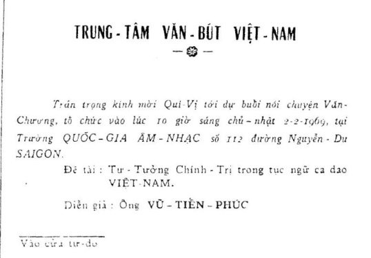 Thiệp mời của Trung Tâm Văn Bút Việt Nam về buổi nói chuyện văn chương của Gs. Vũ Tiến Phúc vào chủ nhật 2-2-1969![]() |