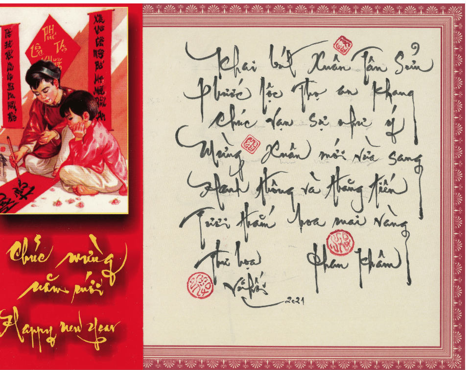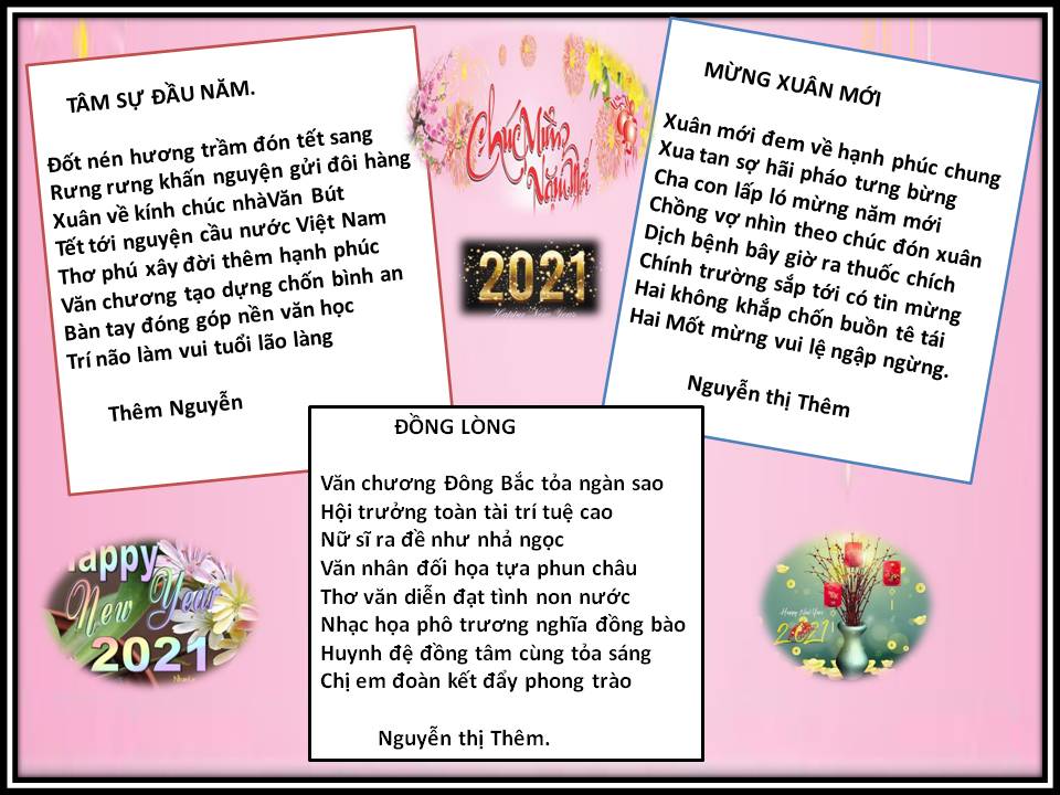 | Chúc Mừng Xuân Tân Sửu Vườn rộn hoa đào Xuân đã sang Chúc nhau thơ, đối, thiệp mai vàng Tân Niên tài đến xài vung vít Trừ Tịch lộc vô trải ngút đàng Tiễn Tý nơi nơi đều hỷ lạc Chào Ngưu chốn chốn đặng khương an Giao Thừa lân pháo xôn xao ngõ Tết Sửu càng vui Năm Sửu càng… Phương Hoa JAN 13th 2021 |