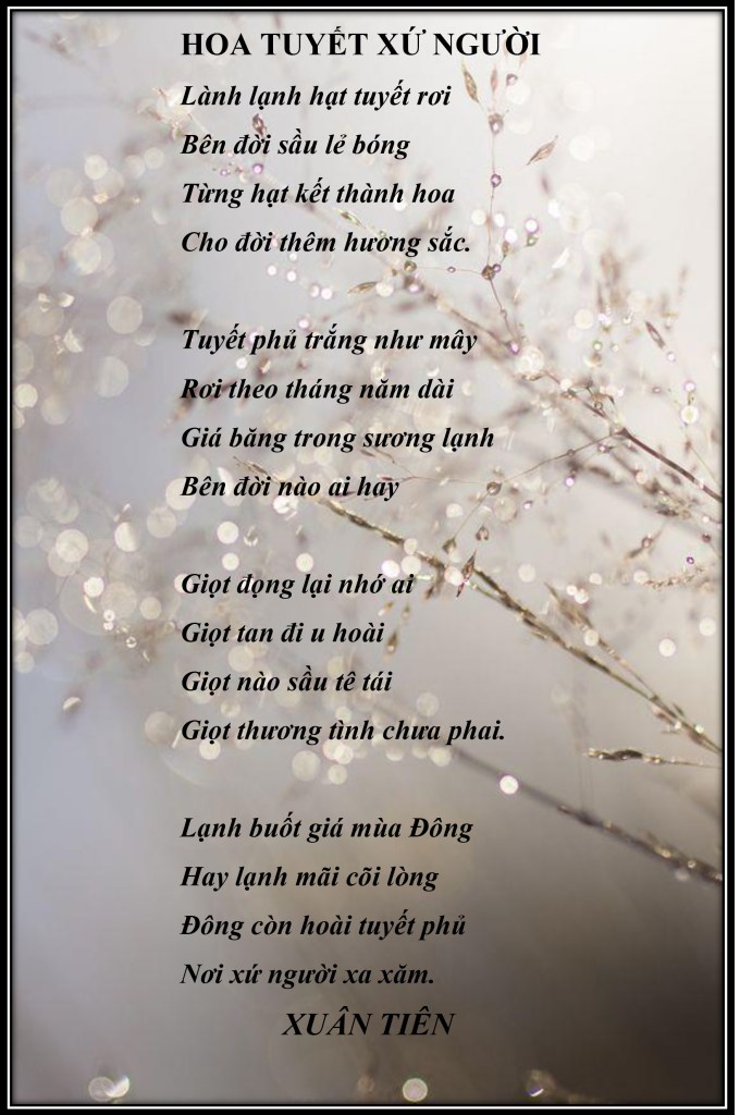 | TÌNH BƠ VƠ Một nửa hồn tôi lạc mất đâu? Con tim rỉ máu ngàn năm sầu Ai gieo mảnh vở tình tê tái Mong đợi chờ người mãi kiếp sau. Tình chỉ là thơ vẫn ngóng chờ Tuyết đông phủ kín liễu đào tơ Nghìn thu vạn kiếp nào ai biết Lỡ dệt mộng rồi tình bơ vơ. Xuân Tiên |