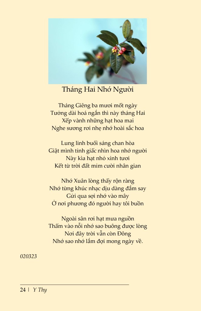 | Ngày Xuân Hoa Lá (Ngũ độ thanh, thủ nhất tự) Tết lại về bên những cỏ cây Trong nhà rực rỡ Cúc vàng lay Trầm Hương gỗ đỏ cành chưa rụng Thạch Thảo hoa mềm cánh đã bay Trộm nhớ Anh Ðào sao tỏ rõ Thầm thương Cẩm Chướng ngại phơi bày Tình sâu nghĩa nặng luôn bền bỉ Thắt chặt nhau vào mãi chẳng thay Y Thi |