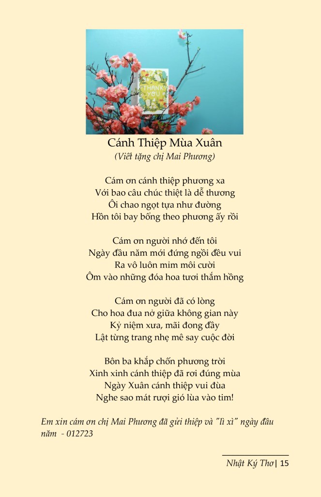 | Chúc Xuân Một chậu hoa Đào trước gió Xuân Mang Xuân rực rỡ biết bao phần Tầm Xuân hé nụ bên khung cửa Dạ Lý chào Xuân cạnh kẽ gân Tuyết trắng mừng Xuân đùa kẻ sĩ Xuân hồng đón Tết cợt thi nhân Ngày Xuân mấy chữ xin trao đến Gửi chút hương Xuân đối với vần Y Thi |
