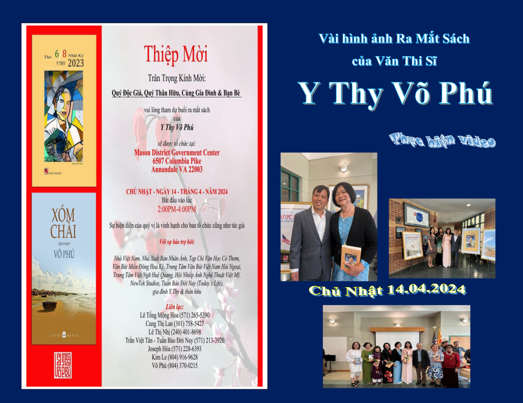 | Tiểu Sử Bút hiệu: Võ Phú (văn) & Y Thy/i (thơ). Võ Phú sinh ngày 10 tháng 11. Sinh quán Nha Trang – Việt Nam; định cư tại Virginia, Mỹ tháng 9 năm 1994. Tốt nghiệp cử nhân Hóa và làm việc tại Virginia Commonwealth University. • Chủ nhiệm và chủ bút tạp chí Kết Ðoàn 2002-2008. • Ðiều hành nhà xuất bản Kết Ðoàn 2002-2004. • Góp mặt trong các báo, đặc san, tạp chí, thi đàn, như: Suối Nguồn, Hồn Quê, Văn Học Nghệ Thuật Liên Mạng, Kỷ Nguyên Mới, Văn Hữu, Cỏ Thơm, Ngôn Ngữ… • Góp mặt trong các tuyển tập thơ Cụm Hoa Tình Yêu, Tình Thơ Mùa Xuân, Tình Thơ Mùa Thu, Tình Thơ Quê Hương, 44 Năm Văn Học Việt Nam Hải Ngoại (1975-2019)… Sách đã in: Văn: – Xóm Chài – Lotus Media – 2022 – Nước Mỹ: Những Mảnh Ghép Rời – Nhân Ảnh – 2020 – Vấn Vương (viết chung với Mai Ngọc Lan) – Kết Ðoàn – 2004 – Tưởng Như Ðã Mất – Suối Nguồn – 2003 Thơ: – Lạc Vào Cõi Thu – Nhân Ảnh – 2021 – Ngày Tháng Có Nhau – Văn Học Mới – 2018 – Những Phương Trời Nhớ (thơ 10 tác giả) – Kết Ðoàn – 2004 – Ðời Chia Trăm Nhánh Sông (thơ 6 tác giả) – Suối Nguồn – 2002 – Rằng Ta Ðang Yêu – Suối Nguồn – 2001 – Cung Ngữ (thơ 10 tác giả) – Suối Nguồn – 2001 Giải thưởng văn học: – Giải Viết Về Nước Mỹ: 2021, 2019, 2017, 2005 – Giải nhất thơ văn – University of Maryland – 2001 Y Thy Võ Phú https://www.facebook.com/ythy.phuvo phuvophotography@gmail.com |